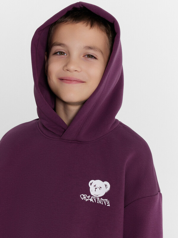 Худи свободного силуэта для мальчиков. Изготовлено из легкого трикотажного футера без подчеса. Есть удобный капюшон, который состоит из двух частей, а спереди идет внахлест. Рукава длинные, на манжетах из рибаны – как и пояс по нижнему срезу. Линия плеча слегка спущена, а плечевые швы перенесены вперед, что гарантирует свободу движений. Изюминкой модели является вместительный карман-кенгуру. Рекомендуем!