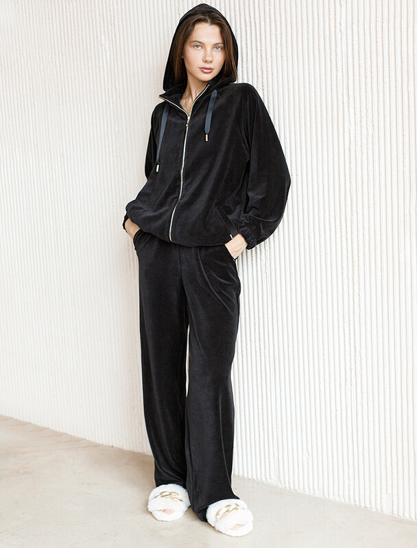 Худи на двухсторонней молнии выполнено из бархатистого велюра. Модель дополнена резинкой по низу и боковыми карманами. Легкий и мягкий материал с матовой фактурой придает изделию нежность и комфорт. Хорошо держит тепло и форму – идеальное решение для домашнего отдыха. Сочетается в костюме с брюками D44.117