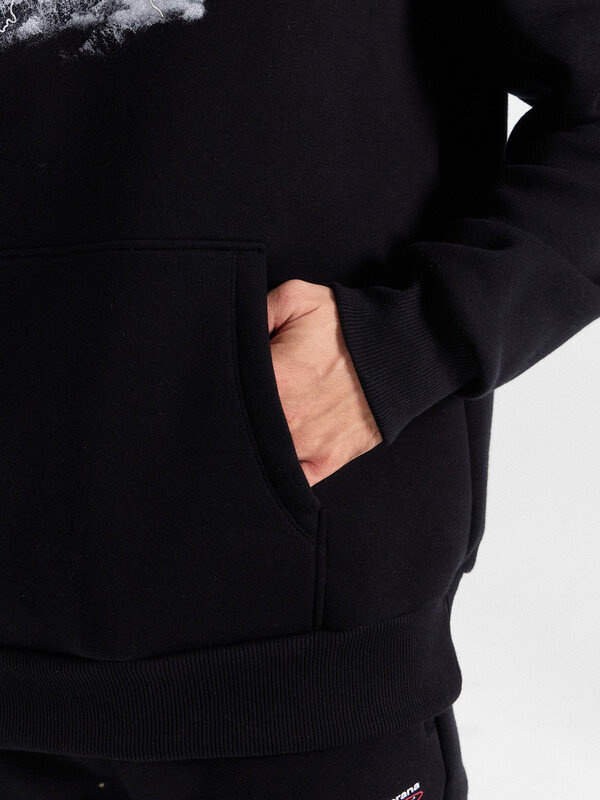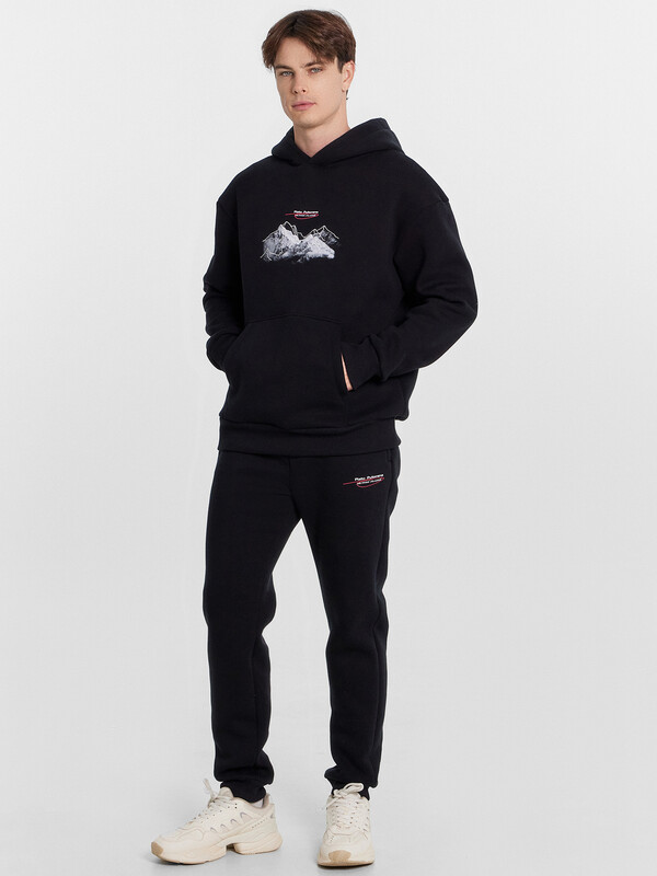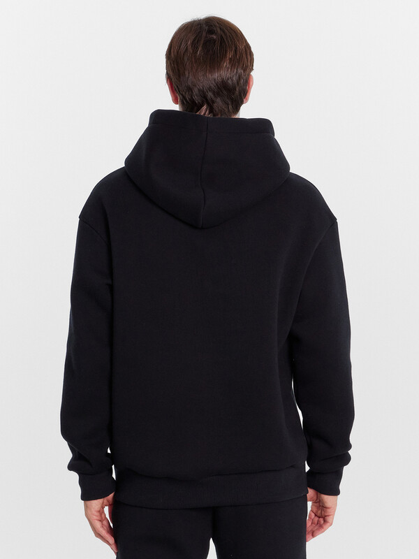 Мужское худи свободного силуэта из трикотажного футера с теплым подчесом. Круглая горловина с капюшоном, длинные рукава на манжетах, слегка спущенная линия плеча, пояс из рибаны – худи удачно сочетает комфортный дизайн и отличное качество!