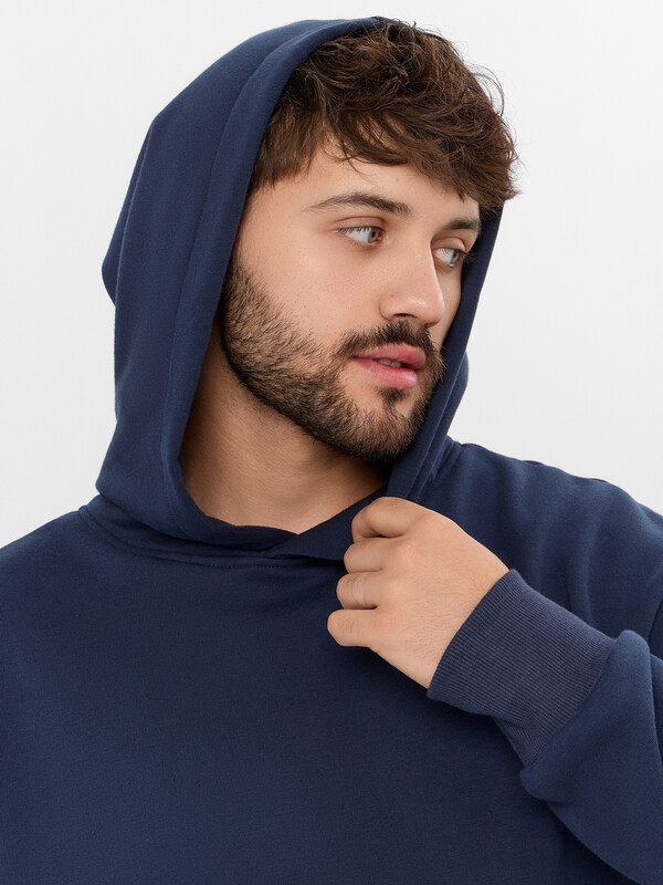 Мужское худи свободного силуэта из трикотажного футера с теплым подчесом. Круглая горловина с капюшоном, длинные рукава на манжетах, слегка спущенная линия плеча, пояс из рибаны – худи удачно сочетает комфортный дизайн и отличное качество!