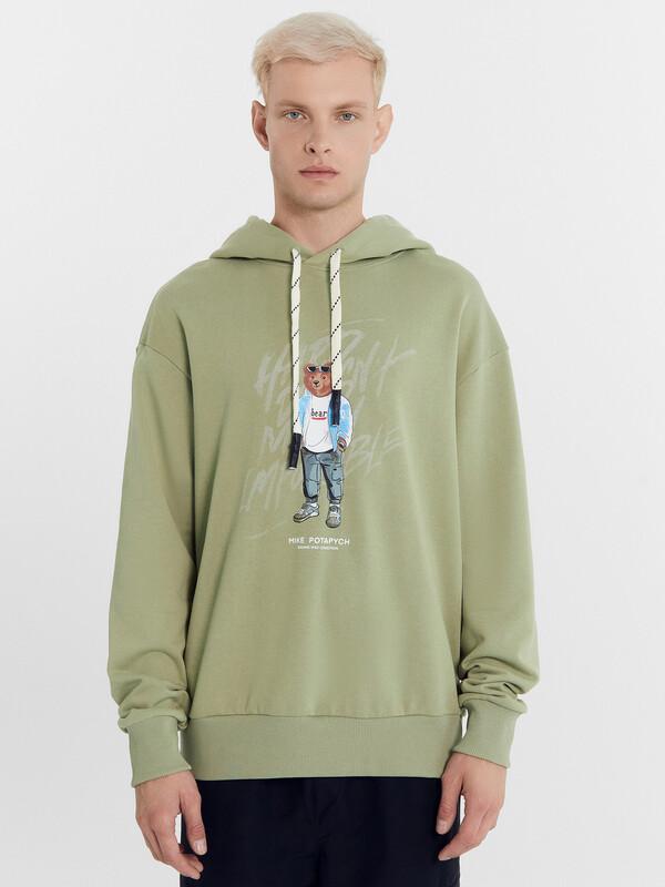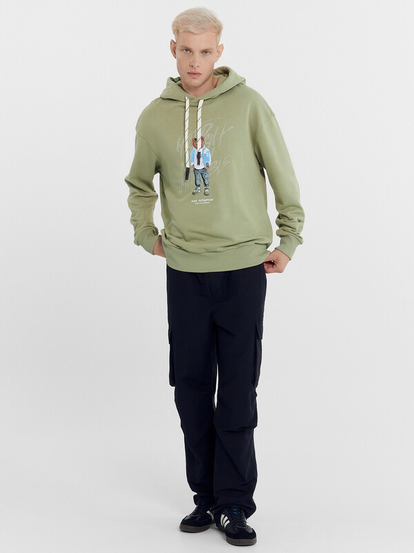 Мужское худи свободного силуэта из трикотажного футера без подчеса. Круглая горловина с капюшоном, длинные рукава на манжетах, слегка спущенная линия плеча, пояс из рибаны – худи удачно сочетает комфортный дизайн и отличное качество!