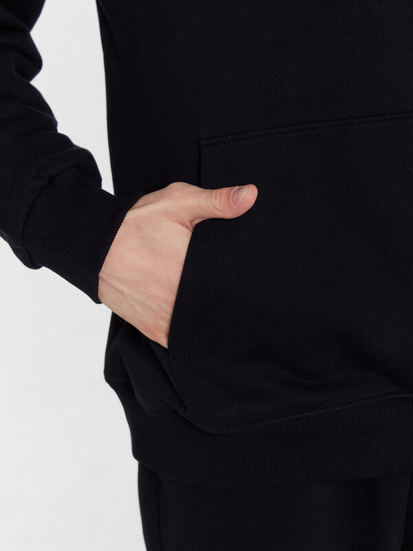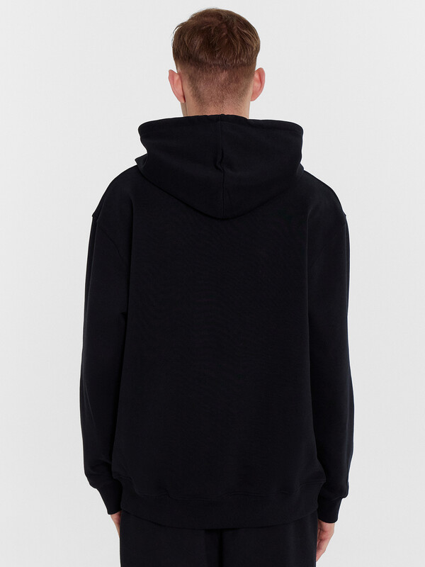 Хиди прямое свободное. Горловина округлой формы с капюшоном. Капюшон со средним швом на подкладке из основного полотна. На внешней стороне пробиты петли и втянут шнур (8КXW-1 8мм) с узлом на концах. Рукав втачной, длинный с отрезными манжетами из рибаны. Линия плеча спущена. По переду накладно карман кенгуру. По низу худи отрезной пояс из рибаны.
