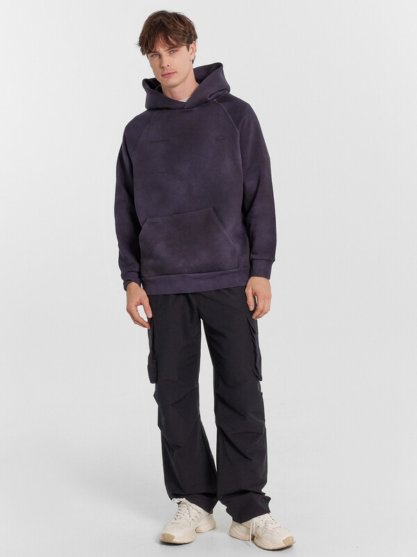 Мужское худи из трикотажного футера с теплым и нежным подчесом. Силуэт свободный, оверсайз. Вырез круглый, классический, с уютным капюшоном. Рукава свободные, с манжетами. Накладной карман-кенгуру и эластичный пояс из рибаны делают худи еще более уютным.