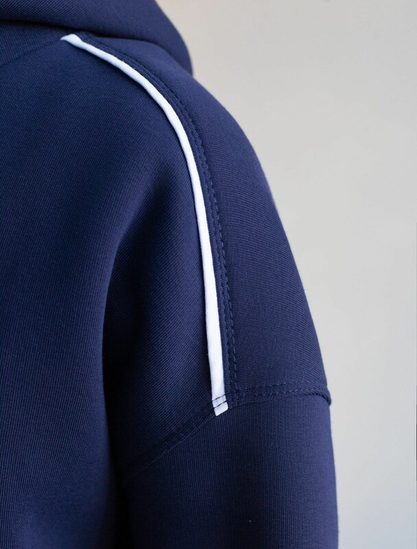 Уютное худи темно-синего цвета с цельнокроенным капюшоном и спущенной линией плеча создано для комфорта в холодную погоду. Модель выполнена из премиального футера трехнитки с мягким начесом, что обеспечивает дополнительное тепло и приятные ощущения при носке. Глубокий капюшон дополнен шнуром для регулировки объема, что обеспечивает отличную защиту от ветра и холода, а серебристая фурнитура добавляет стильный акцент к современному худи. Элементы дизайна — минималистичная вышивка с логотипом бренда и тонкие онтрастные лампасы — делают худи более выразительным без перегруженности деталями, сохраняя эстетичность и современный вид. Эластичные манжеты на рукавах обеспечивают дополнительную защиту от продувания, способствуя сохранению тепла внутри. Натуральный хлопок гарантирует дышащий эффект, позволяя сохранять оптимальный микроклимат тела даже при длительном ношении. Благодаря эластану в составе повседневное худи подходит для активного отдыха, вы будете чувствовать себя свободно в любой ситуации. Представлены бол