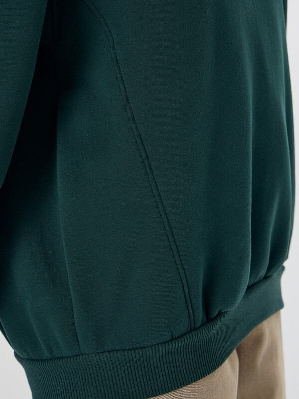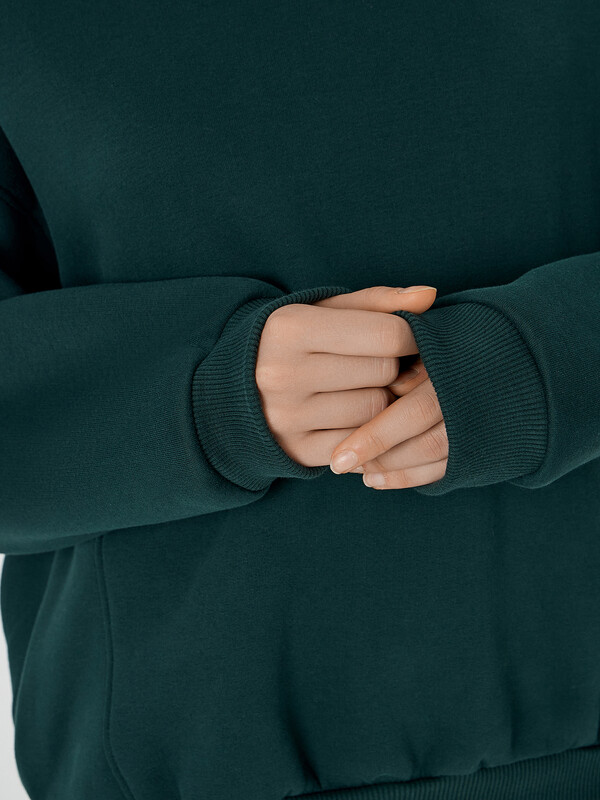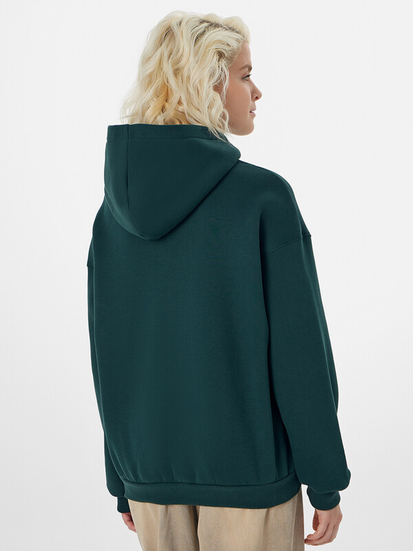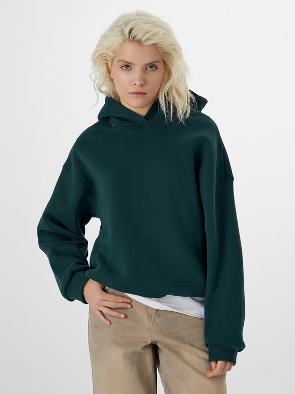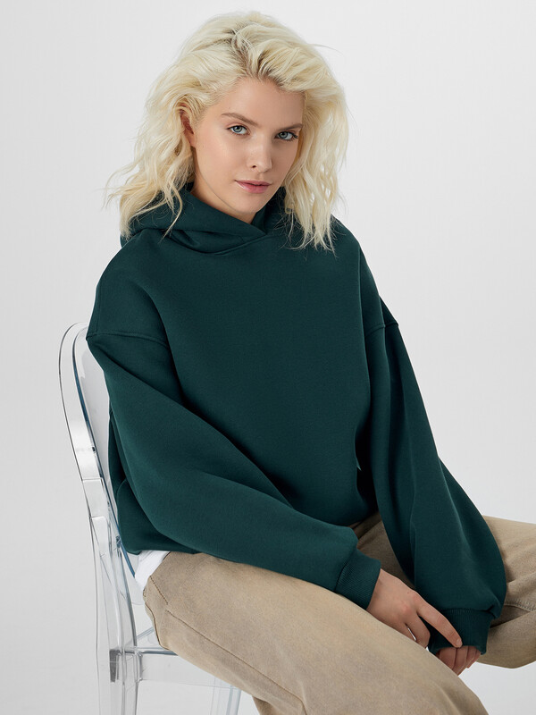 Худи дополнено капюшоном на подкладке и округлой горловиной. Продуманный крой со смещенными вперед швами улучшает посадку, а эластичные манжеты и пояс из рибаны мягко фиксируют форму.