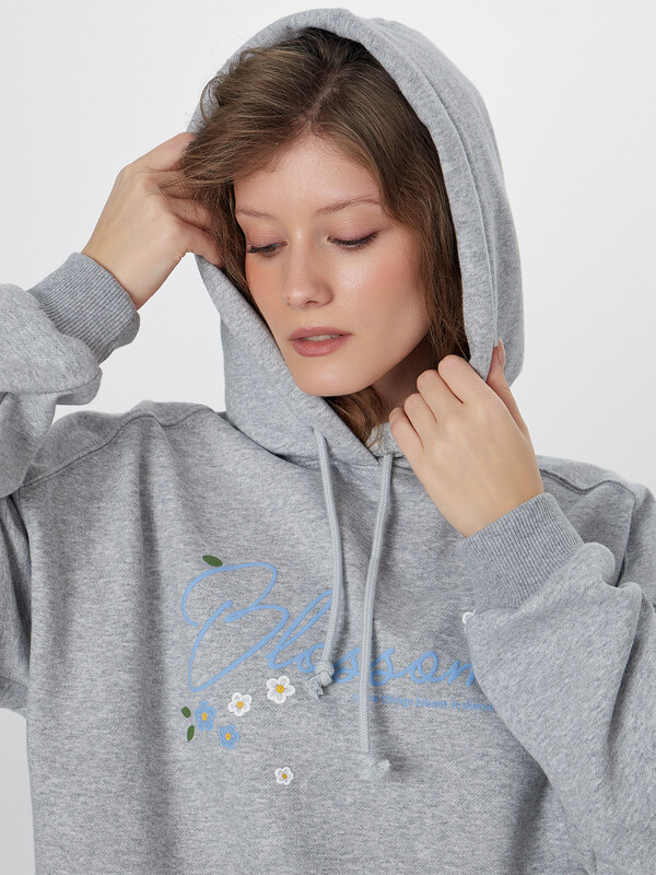 Худи изготовлен из трикотажного полотна футер 3х нитка с подчесом. Худи свободного силуэта. Горловина круглой формы с капюшоном. Капюшон со средним швом на подкладке из кулирки. С внешней стороны пробиты петли и втянут шнур (8КXW-1) с завязвнными концами. Рукава втачные, длинные. Плечо спущено, пройма углублена. По низу рукава отрезная манжета из рибаны. По плечу отрезная декоративная деталь. По низу худи отрезной пояс из рибаны. Шов втачивания обтачки и рукава, плечевые, шов притачивания пояса распошиты.