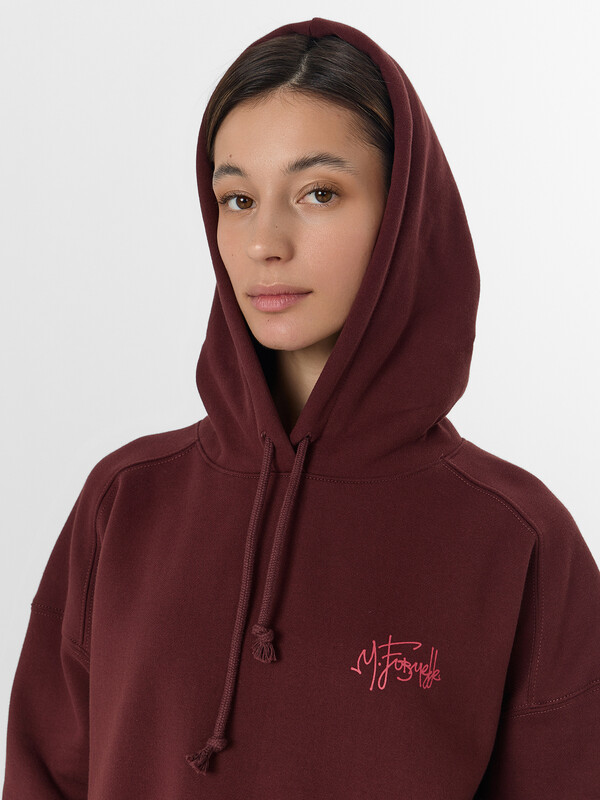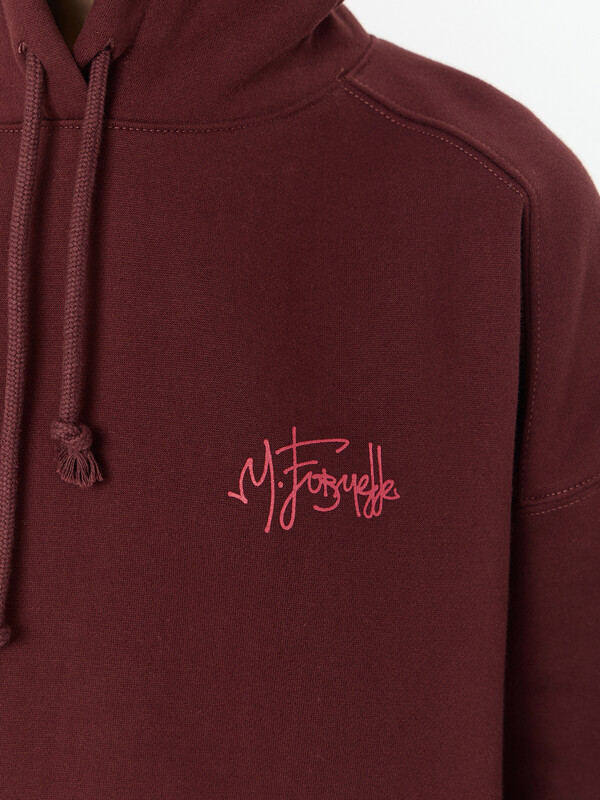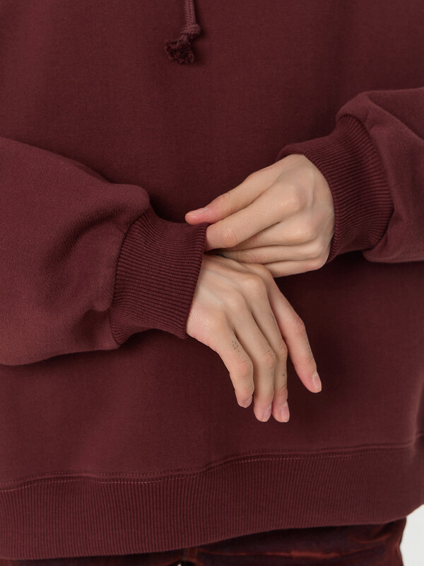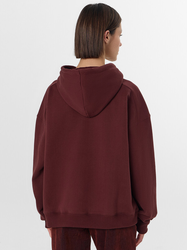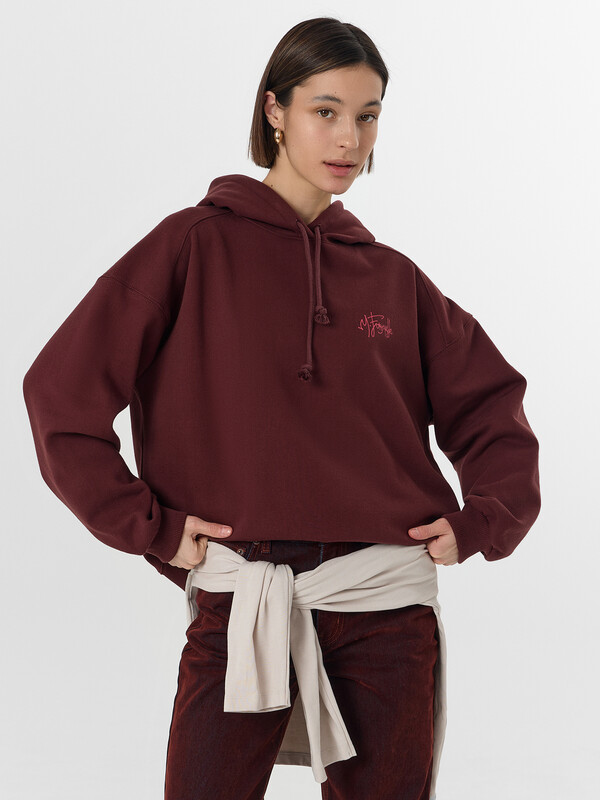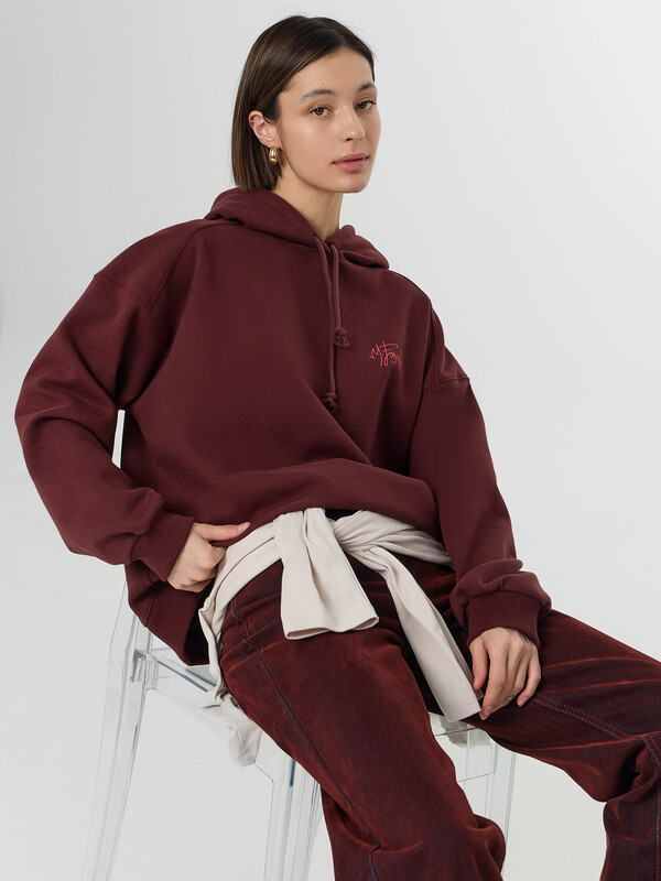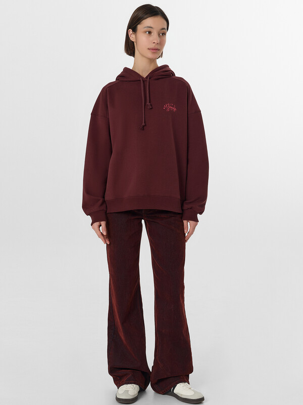 Худи с надписью — это уютная модель для повседневной носки. Худи свободного кроя выполнено из мягкого трёхниточного футера с начесом, который сохраняет тепло и обеспечивает комфорт в прохладную погоду. Капюшон со шнурком и спущенная линия плеча создают расслабленный современный силуэт.