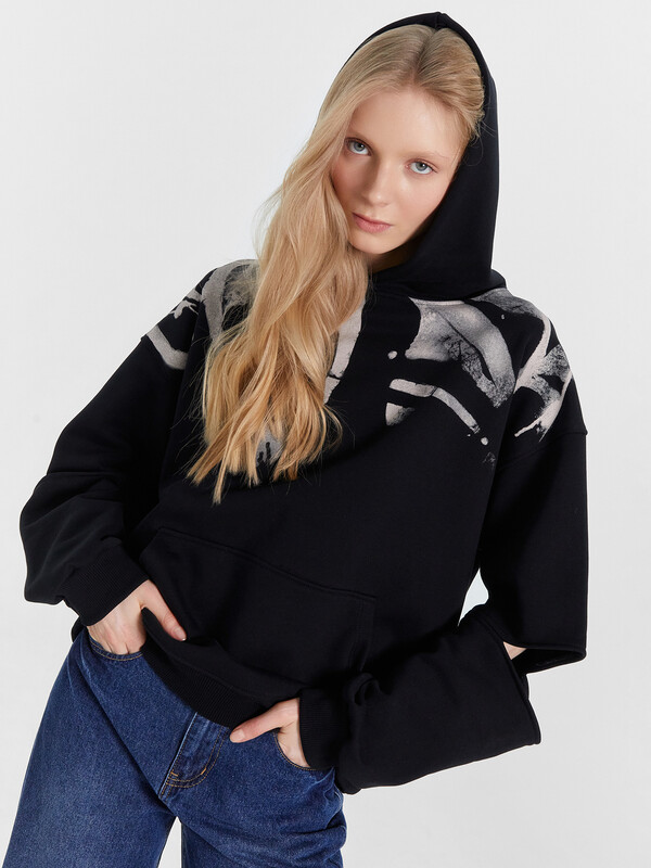 Стильное женское худи свободного силуэта - прекрасное вложение в ваш гардероб, которое станет незаменимым элементом вашего стиля. Изделие выполнено из футера - трикотажного материала с мягкой изнанкой, обеспечивающего тепло и комфорт, при этом позволяя коже дышать. Этот материал отличается своей прочностью и долговечностью, что делает его идеальным для повседневной носки. Эта стильная модель оснащена уютным капюшоном, длинными рукавами со спущенной линией плеча и эффектными разрезами на уровне локтей. Манжеты также декорированы разрезами, добавляя изюминку в общий дизайн. Спереди находится накладной карман-кенгуру, который добавляет практичности и завершает образ. Стильное и удобное худи станет вашим любимым выбором для любых повседневных образов.