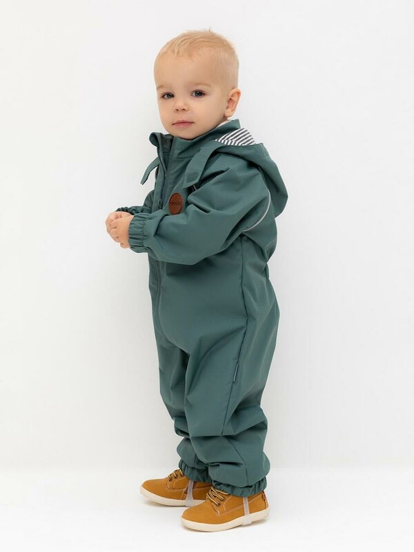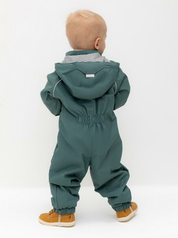 Ветровочный комбинезон ясельный из мембранной ткани с дополнительной тефлоновой обработкой. Данный вид обработки предохраняет изделие от загрязнения и лучше отводит влагу. Подклад из 100% хлопка. У изделия удлиненная молния для легкого одевания с защитой подбородка. Утяжка на капюшоне с потайными стопперами. По низу рукавов и брючин, а также на спинке изделия эластичная резинка для лучшего прилегания. Для фиксации комбинезона используются съемные силиконовые штрипки. В размерах 68-74 и 74-80 функциональные отвороты на рукавах и брючинах. Во всех изделиях верхнего ассортимента для безопасности ребенка предусмотрены светоотражающие элементы.