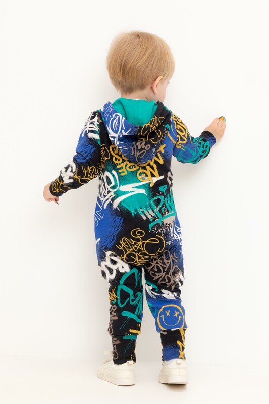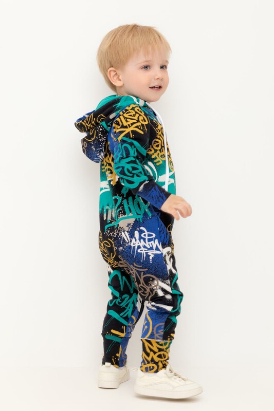 Комбинезон для мальчика из футера с начесом. Манжеты выполнены их эластичного трикотажа в рубчик. Застёжка на молнию с защитой шеи и подбородка. Оригинальная набивка выполнена из стойких текстильных гипоаллергенных красителей.