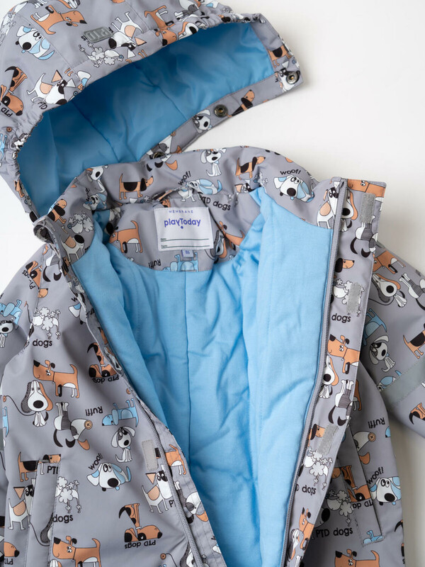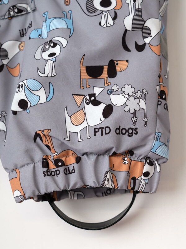 Лёгкий детский комбинезон для новорожденного мальчика. Температурный режим от +15°C до 0°C. Ткань с мембранным покрытием 5000х5000. Внутри мягкая подкладка из трикотажа. Ветрозащитная планка на липучках. Комбинезон украшен ярким принтом с мультяшными собаками и надписями. Съёмный капюшон на резинке. Манжеты на резинке. Два боковых кармана. Съемные эластичные штрипки. Для безопасности добавлены светоотражающие элементы по капюшону, рукавам и брючинам.
