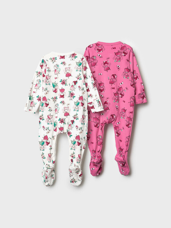 Комплект из двух мягких детских комбинезонов с закрытыми ножками для новорождённой девочки. Один из них выполнен в светлой цветовой гамме с яркими принтами цветов и кукол, второй — в насыщенном розовом цвете. Комбинезоны имеют длинные рукава, застёгиваются спереди на кнопки, которые продолжаются по внутренней стороне ножек для удобства переодевания. В размерах 56 и 62 предусмотрены отвороты на рукавах, выполняющие функцию варежек. Материал - 100% хлопковый трикотаж интерлок.