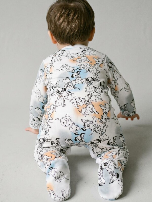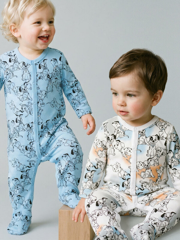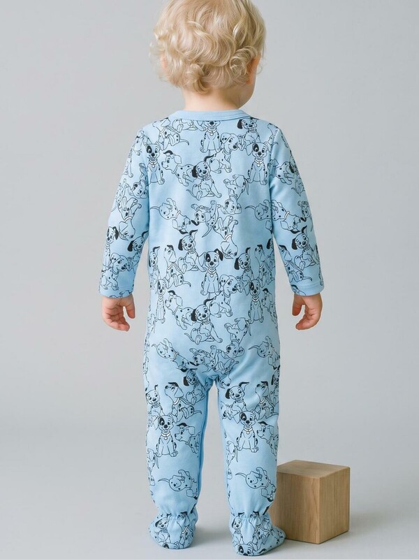 Набор из двух мягких трикотажных комбинезонов с закрытыми ножками для новорождённого мальчика. Один комбинезон — нежно-голубого цвета с принтом в виде весёлых щенков, второй — белый с такими же щенками и пастельными пятнами. У обоих — длинные рукава с отворотами, которые можно использовать как варежки-царапки, и удобная застёжка на кнопках спереди и по низу. Внизу — резиночки на щиколотках для хорошей посадки. 100% хлопковый трикотаж интерлок.