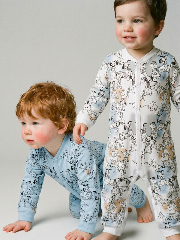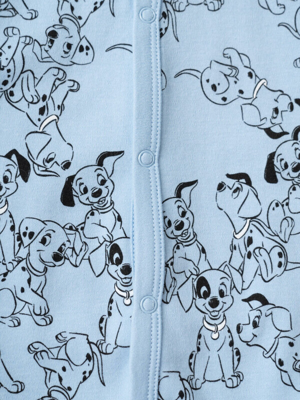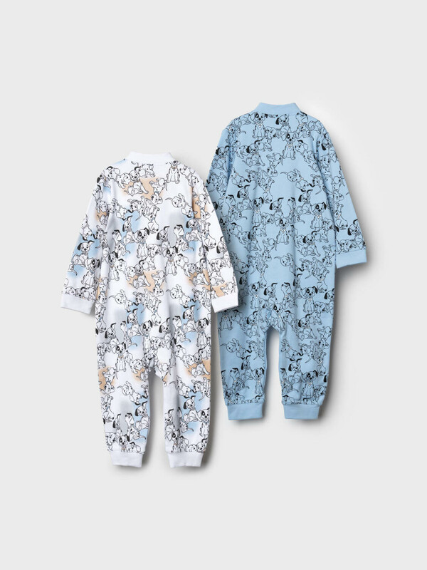 Комбинезон для новорожденного мальчика. Набор из 2 штук. Один — с ярким принтом на белом фоне с голубыми и бежевыми акцентами, второй — однотонный голубой с рисунками щенков. Модель с длинными рукавами и манжетами на запястьях и щиколотках, застегивается спереди на кнопки, проходящие до низа. Изготовлен из мягкого хлопкового трикотажного полотна — интерлока.