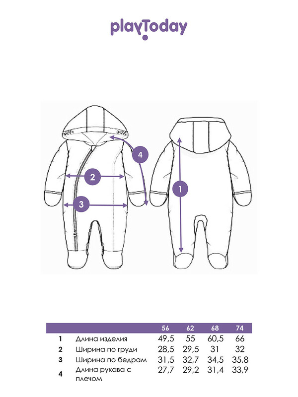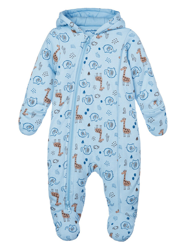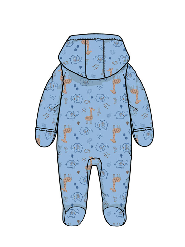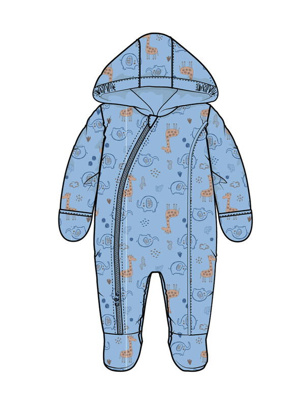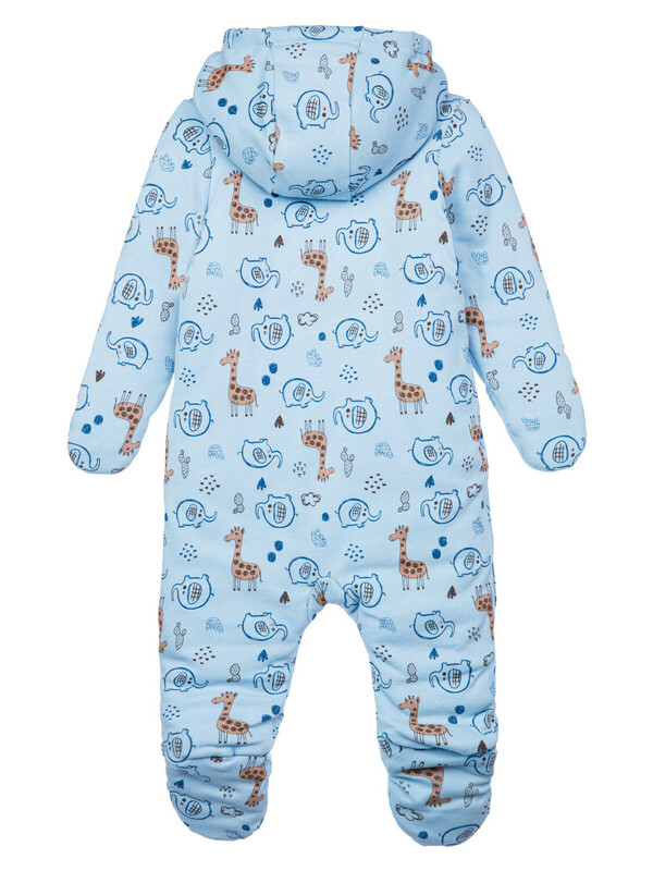 Комбинезон из натурального хлопка с утеплителем. Капюшон с легкой фиксацией на резинку. Удобная застежка на молнию. На рукавах митенки.