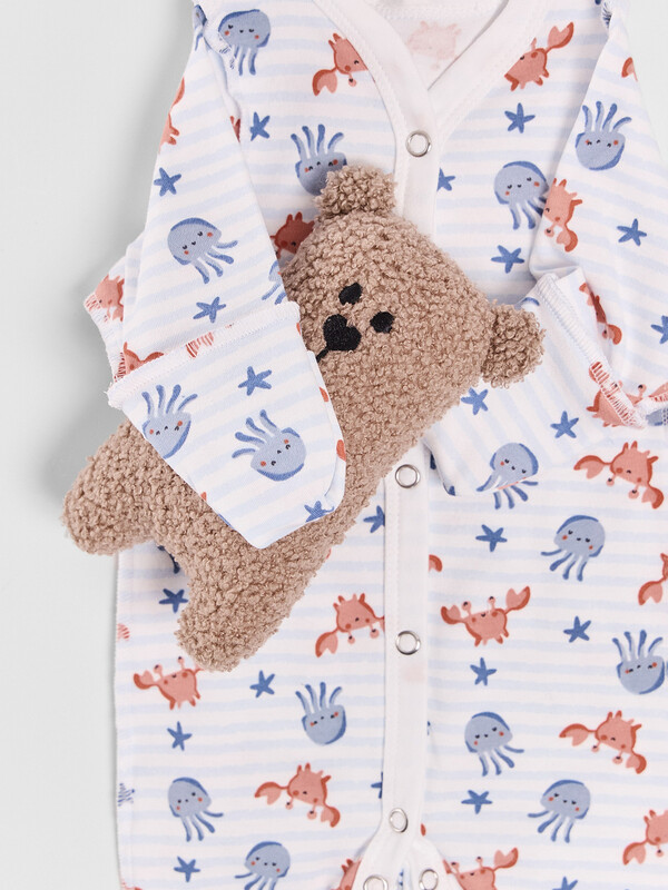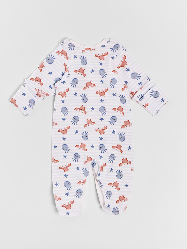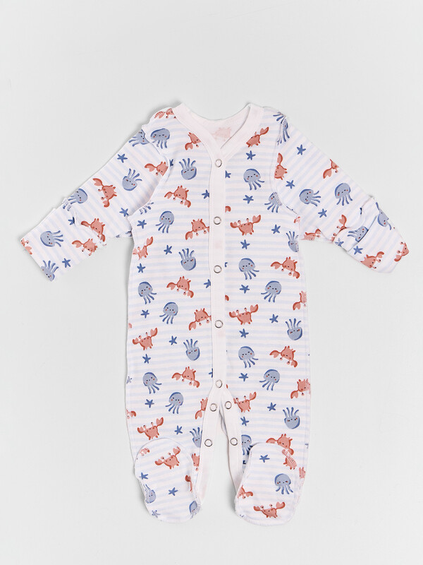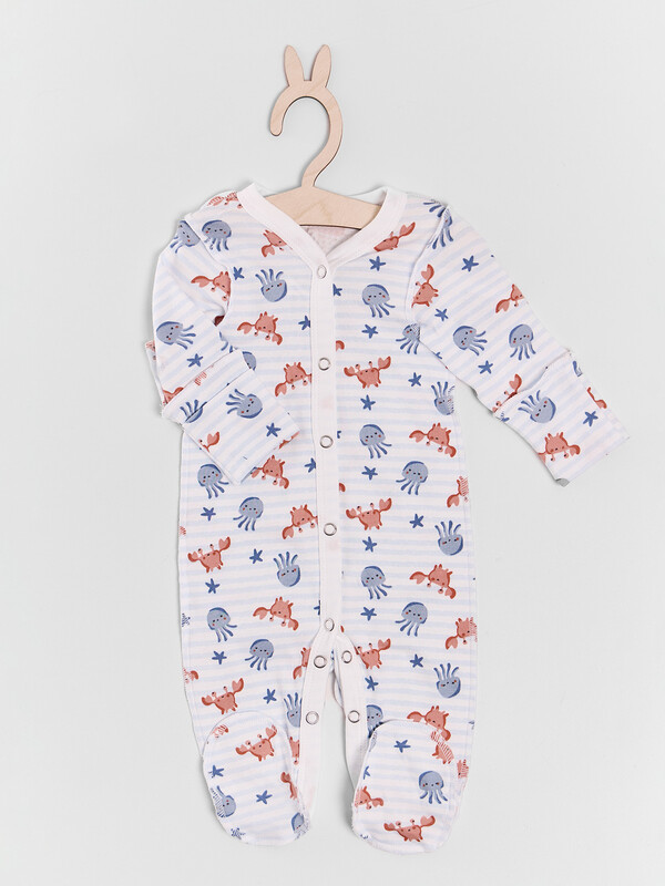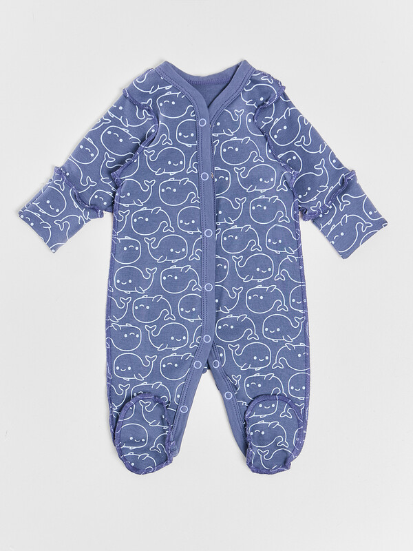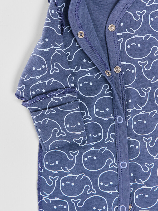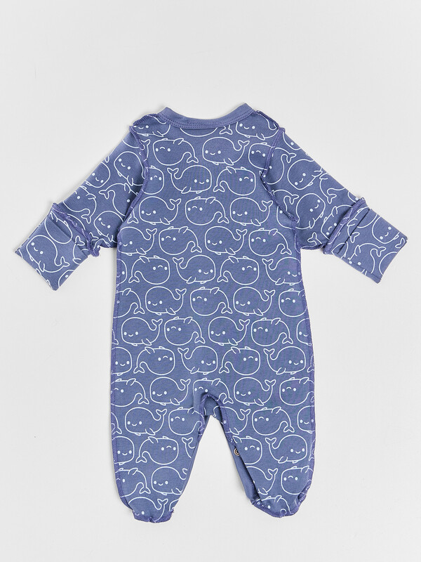 Цельнокроенная спинка и удобная застежка на кнопках от горловины до низа упрощают смену подгузника. Рукава и горловина аккуратно обработаны мягкой бейкой, которая нежно прилегает к телу. Дополнительная ластовица в шаговом шве и следы с отрезной верхней частью обеспечивают удобство и защиту.
