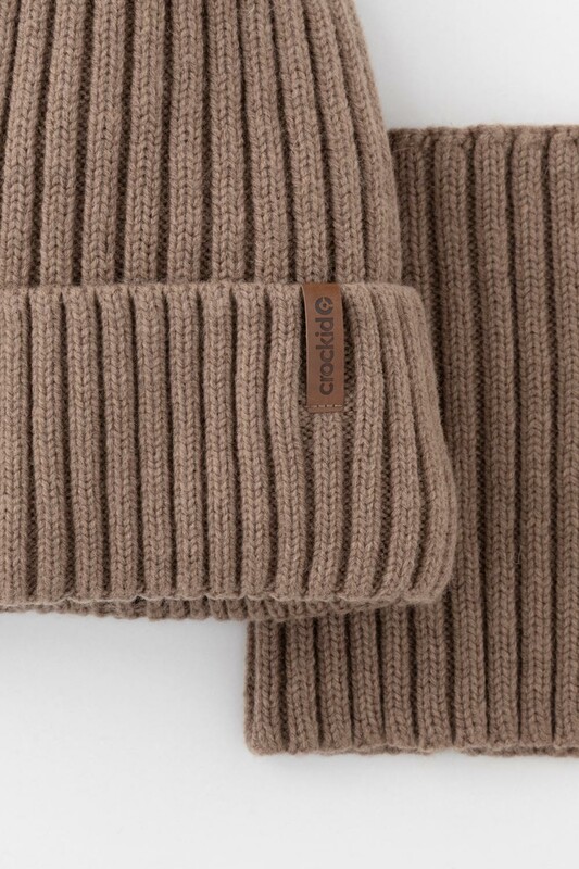 Комплект детский: шапка и снуд из полушерсти. Тёплая вязаная шапка с отворотом на подкладе из флиса. Украшена нашивкой из искусственной кожи. Узкий снуд без оборотов вокруг шеи. Изделие сохраняет форму и стойкий цвет после многочисленных стирок.