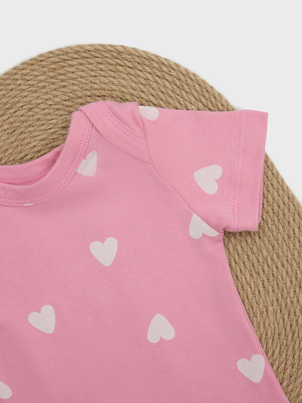 Комплект состоит из боди и ползунков. Боди выполнено из интерлока. Спинка и перед цельнокроенны. Спинка с переходящей кокеткой и цельнокроенной ластовицей. Горловина круглая, окантована бейкой из основног полотна. Припуски верхних и нижних срезов переда и спинки окантованы бейкой из основго полотна. Рукава короткие, втачные, одношовные.