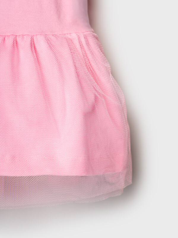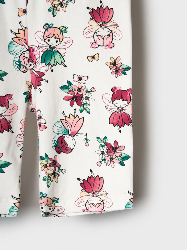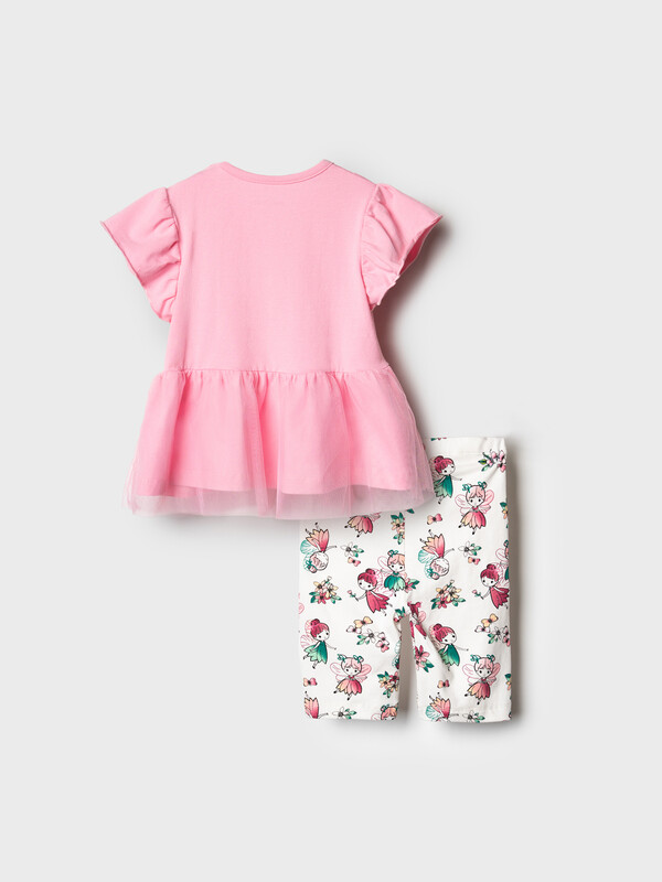 Детский комплект для девочки. Состоит из футболки с короткими рукавами и укороченных легинсов. Футболка выполнена из хлопкового трикотажа джерси и украшена милым принтом с феей, бабочками и объемным сердцем-аппликацией. Низ футболки оформлен воздушной баской из сетки, которая придает изделию нарядный вид. Для удобства переодевания на плече предусмотрены кнопки. Легинсы выполнены из мягкого трикотажа с нежным рисунком. Пояс эластичный, обеспечивает комфортную посадку.