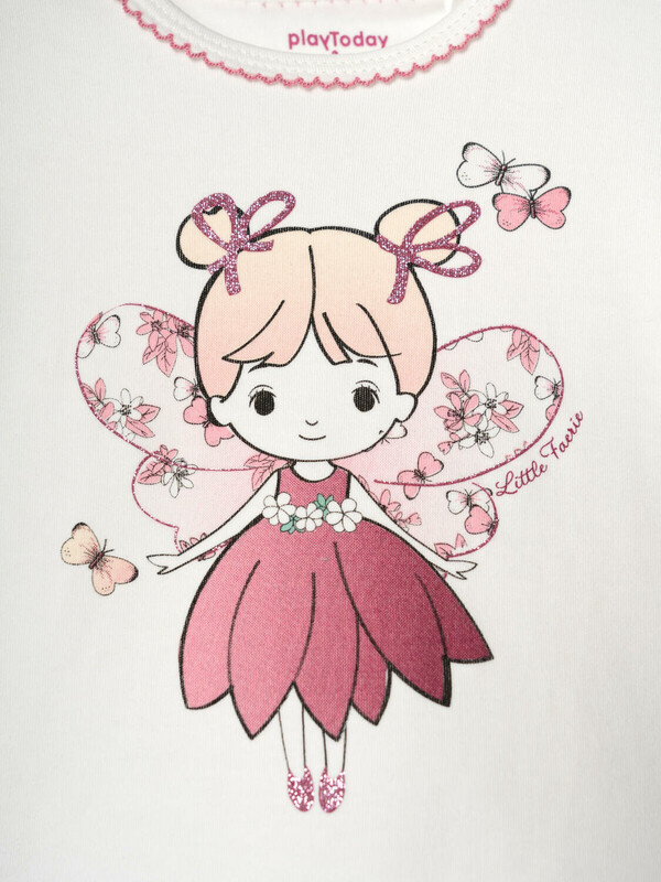 Нежный детский комплект для девочки. Состоит из футболки с коротким рукавом и брюк. Выполнен из хлопкового трикотажа. Футболка украшена крупным принтом с феей. По низу футболки - рюша, которая добавляет образу воздушности. Горловина округлая, а на плече предусмотрены кнопки для удобного переодевания. Брюки с рисунком с феями, цветами и бабочками. Посадка высокая, пояс на мягкой резинке с декоративным шнурком для регулировки посадки.