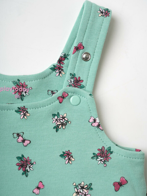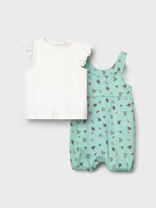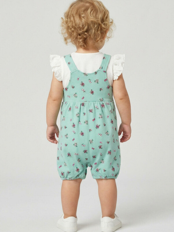 Детский комплект для девочки. Состоит из мягкой трикотажной футболки и полукомбинезона. Футболка имеет аккуратные короткие рукава с рюшами и удобные кнопки на плече, благодаря которым изделие легко надевать и снимать. Полукомбинезон выполнен из трикотажа с нежным цветочным принтом, с бретелями на кнопках и мягкой резинкой по низу штанин для комфортной посадки.