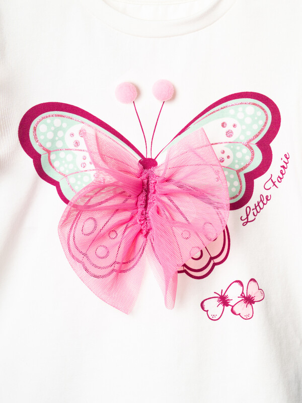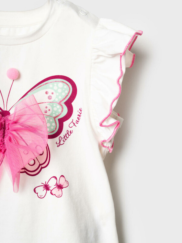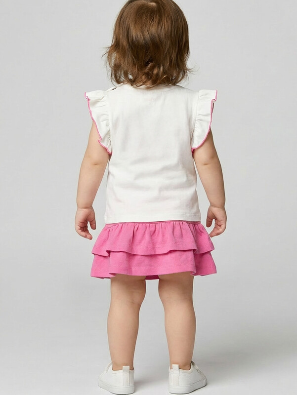 Легкий детский комплект для девочки. Выполнен из мягкого хлопкового трикотажа джерси, состоящий из футболки и юбки-шорт. Футболка прямого кроя с нежным принтом и декором из сетки. На плече застежка на кнопки для удобного переодевания. Рукава-крылышки. Пышная юбка на резинке с воланами, внутри имеет удобные шорты, что делает модель практичной для активного отдыха.