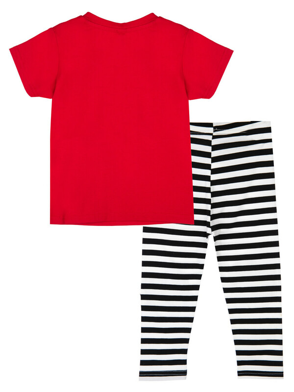 Комплект: футболка и легинсы из качественного эластичного и приятного на ощупь трикотажа. Посадка regular fit – классический крой. Застежка на кнопки на плече. Эластичный пояс. Высокое содержание хлопка 95%. Благодаря наличию эластана в составе ткани изделие держит форму и меньше мнется.