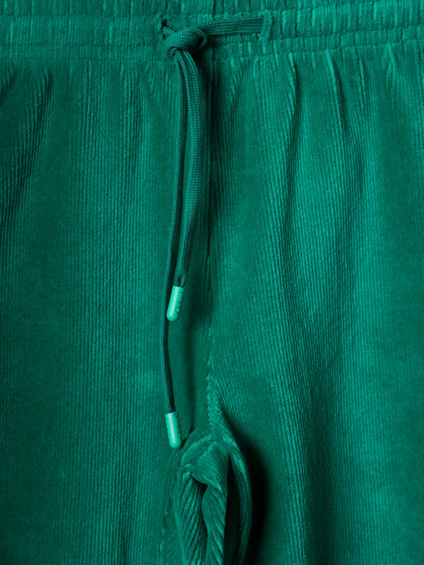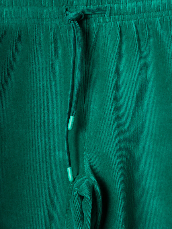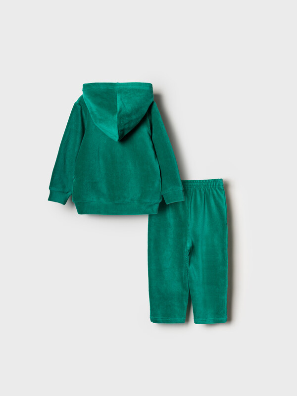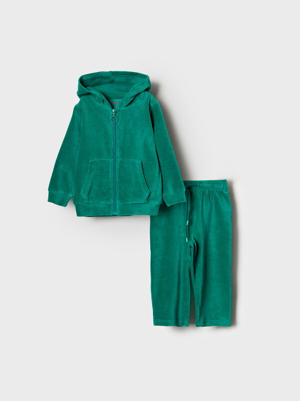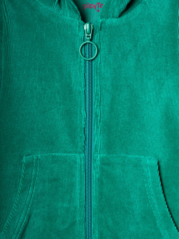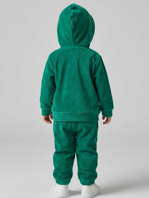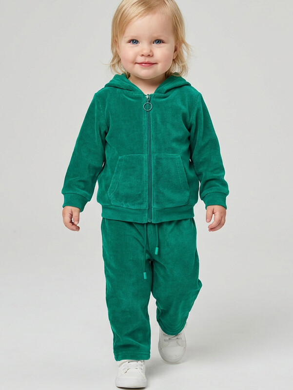 Спортивный вельветовый детский костюм для девочки. Комплект выполнен из хлопкового трикотажа и состоит из толстовки на молнии и брюк на резинке. Толстовка прямого кроя с капюшоном. Брюки — комфортные, с эластичным поясом.