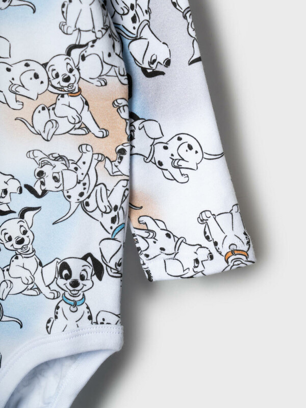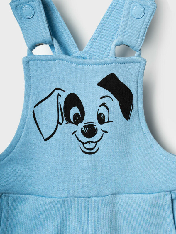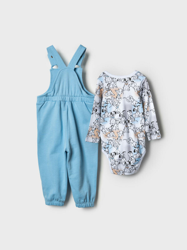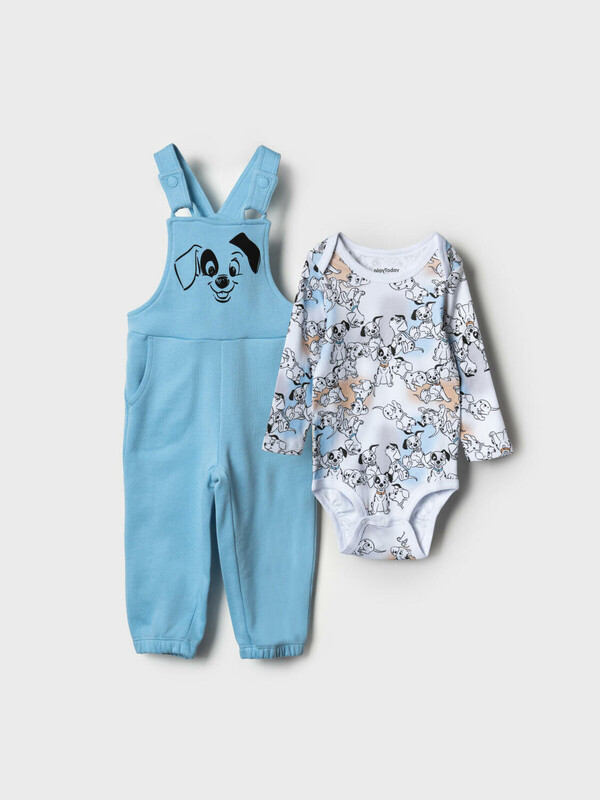 Комплект детский для мальчика. Состоит из двух изделий: боди с длинным рукавом и удобный полукомбинезон. Боди выполнен из мягкого хлопкового трикотажа интерлок с ярким принтом героев «101 далматинец», с застёжкой на кнопках внизу для легкого переодевания. У боди два ряда кнопок - растет вместе с малышом. Полукомбинезон — однотонный хлопковый, на широких перекрестных бретелях, с резинкой на спинке и удобными карманами. На груди размещён крупный рисунок мордочки щенка, а сбоку — милые следы лапок.