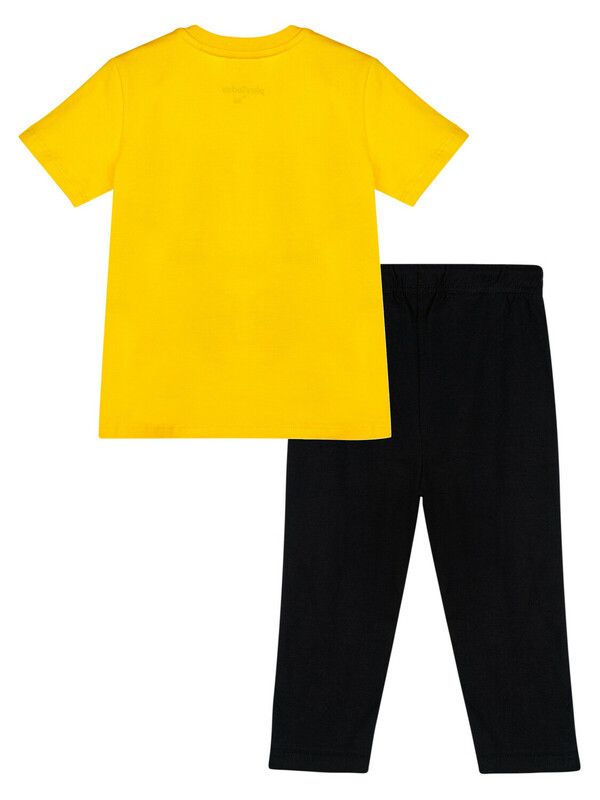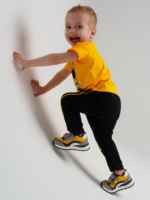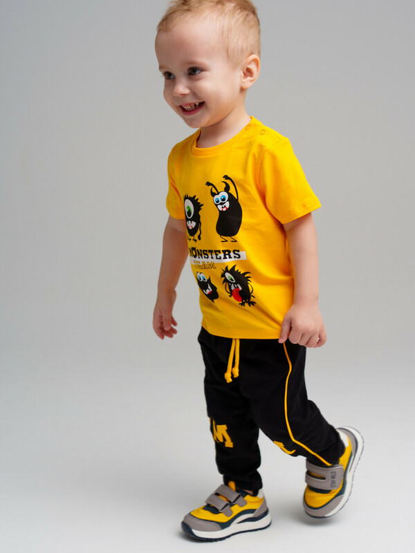 Комплект: футболка и брюки. Выполнен из эластичного и приятного на ощупь трикотажа. Брюки с карманами в боковых швах. Эластичный пояс со шнурком. Эластичные манжеты по низу брючин. Высокое содержание хлопка 95%. Благодаря наличию эластана в составе ткани изделие держит форму и меньше мнется.