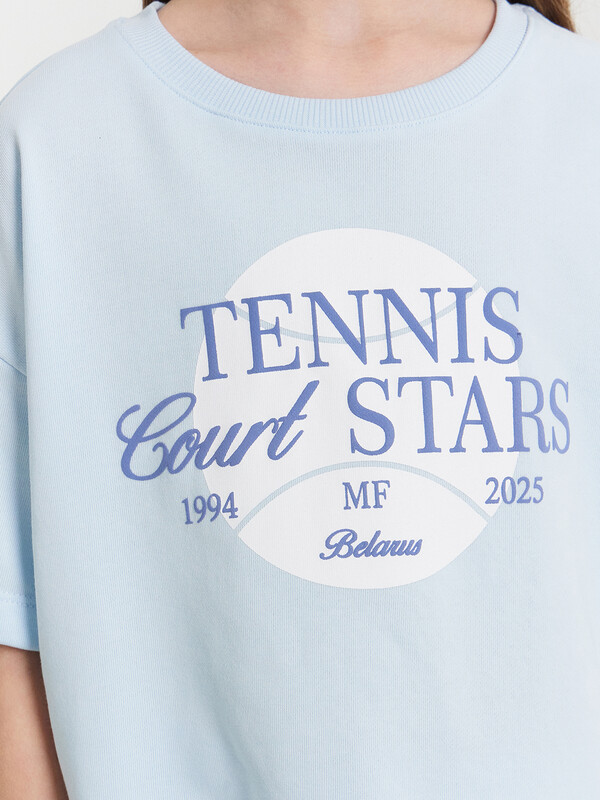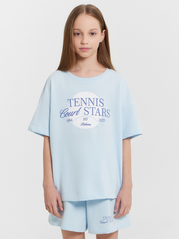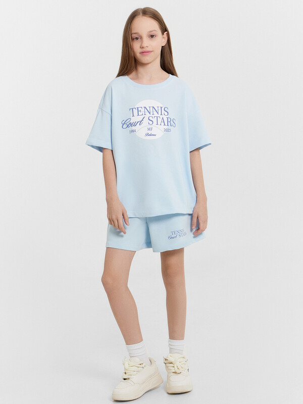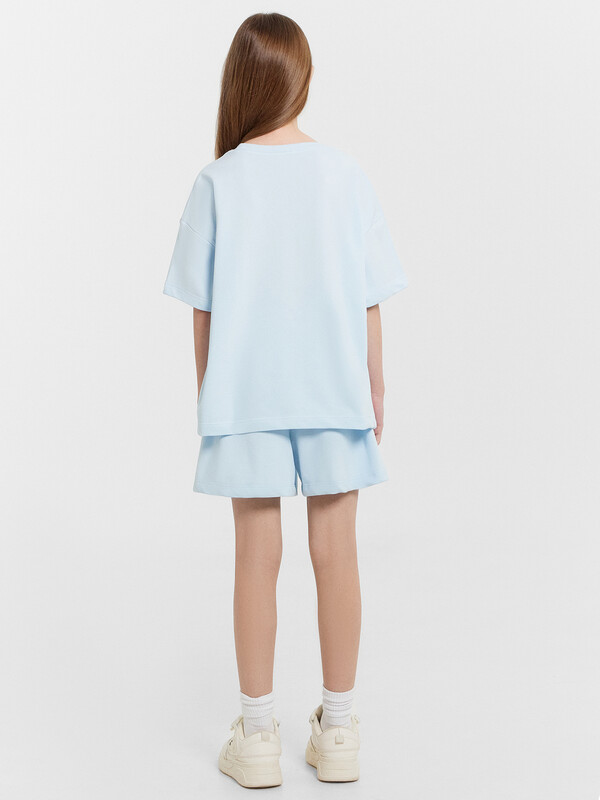 Стильный комплект для девочек. Выполнен из трикотажного футера. Состоит из футболки и шортов. Футболка свободного силуэта длиной до середины бедра, с короткими рукавами и круглой горловиной. Шорты длиной немного выше колен, с эластичной резиной в поясе и регулировочным шнуром. Прекрасный выбор!
