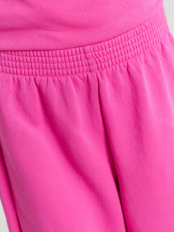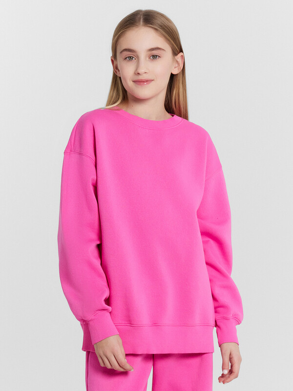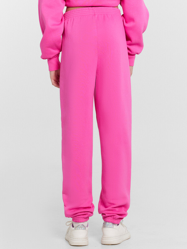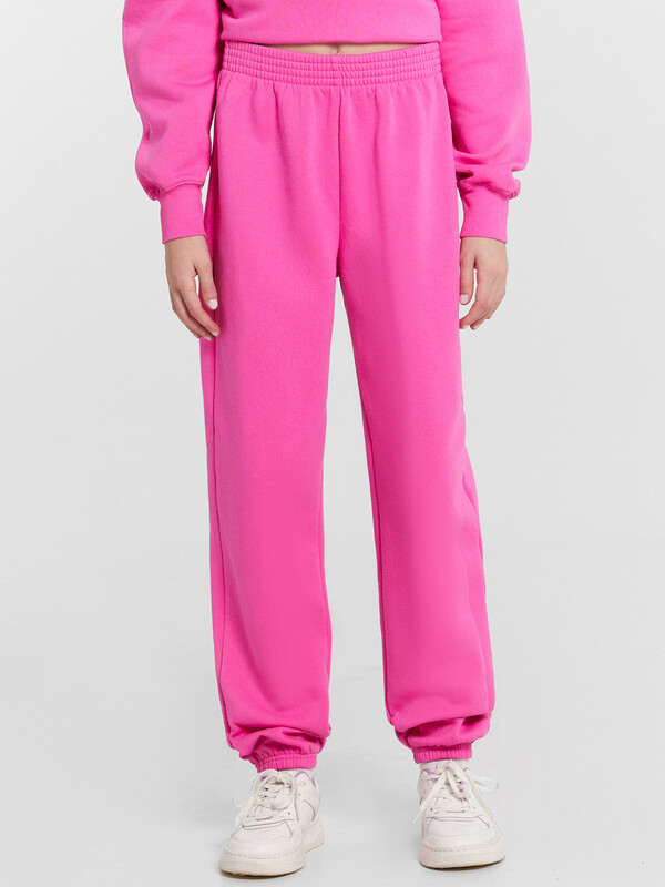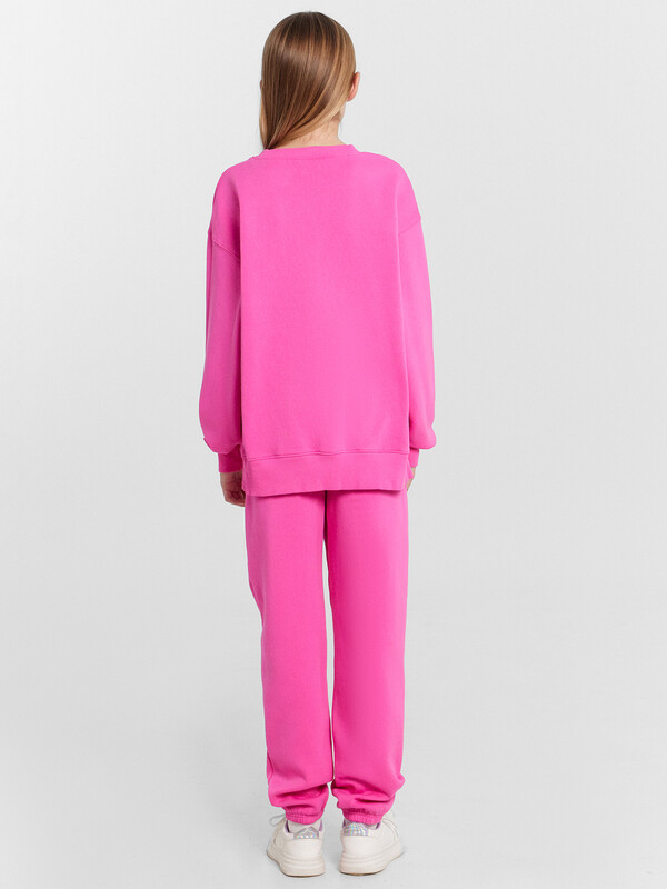 Джемпер свободного силуэта. Рукава длинные, втачные. Линия плеча спущена. Перед и спинка цельнокроенные. Горловина круглой формы обработана обтачкой из рибаны. По низу рукавов и джемпера притачены манжеты и пояс из рибаны. Брюки свободного силуэта. Посадка средняя. Цельнокроеный пояс с эластичной тесьмой внутри. По поясу выполнены три декоративные строчки. По низу брюк застрочена внутрь эластичная тесьма.