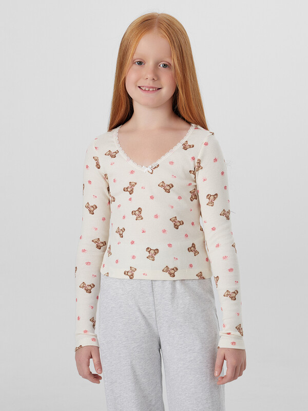 R-25 (R22-001.01.180) 100% хлопок, 115 см, 180 гр/м?. Горловина V-образной формы, обработана кружевом 15 мм, Devsel L20166-1.5. Рукава длинные втачные, одношовные. Перед и спинка цельнокроеные. Низ джемпера, рукавов и брюк обработан на 2х игольной плоскошовной машине швом в подгибку.