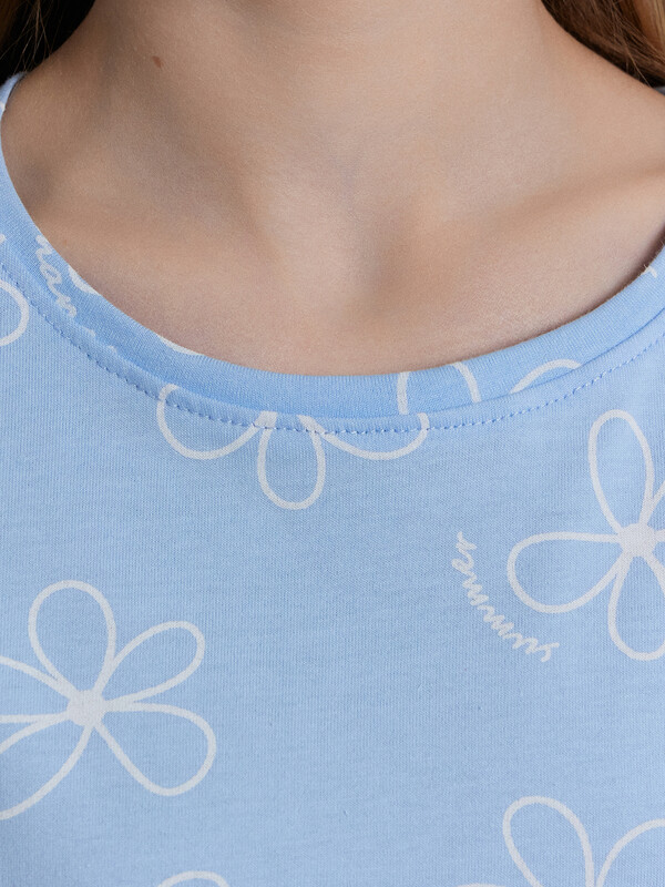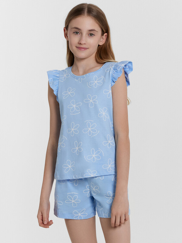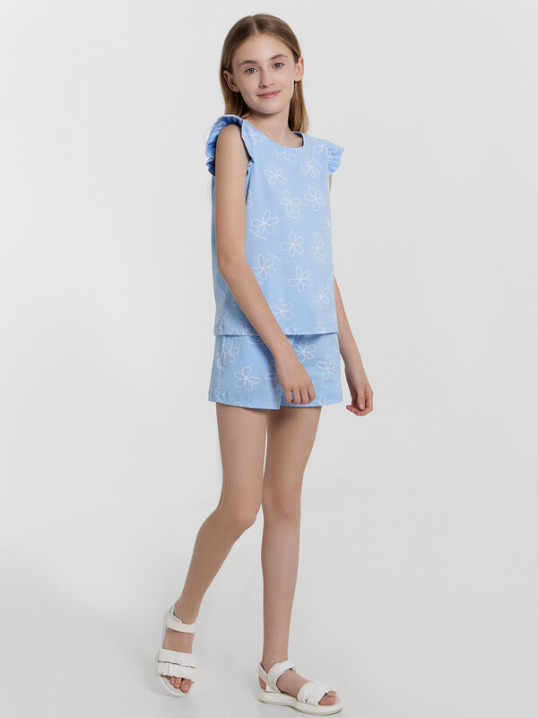 Легкий и привлекательный комплект из трикотажной кулирки. Включает необычную футболку и мини-шорты. Футболка прямого силуэта, длиной до середины ягодиц, с круглой горловиной и необычными короткими рукавами, украшенными рюшами. Шорты короткие, с боковыми карманами и эластичной резиной в поясе. наверняка понравится вашей девочке!