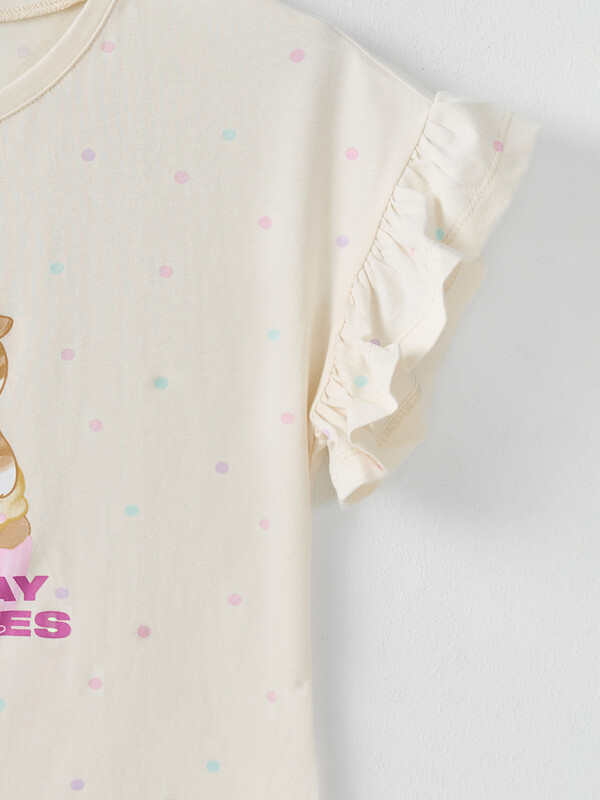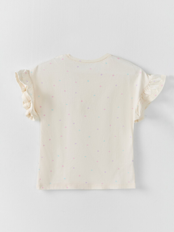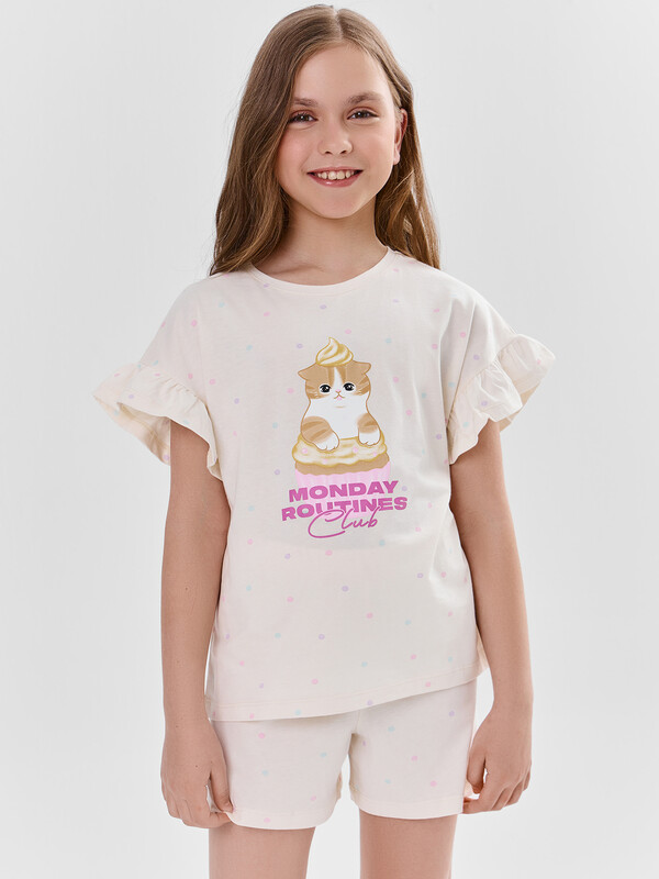 Футболка прямого силуэта. Перед и спинка цельнокроенные. Рукав цельнокроеный короткий. Горловина круглой формы, обтачка из основного полотна. К низу рукава притачена рюша из основного полотна. Низ изделия и рюши обработан на 2-х игольной плоскошовной машине швом в подгибку.