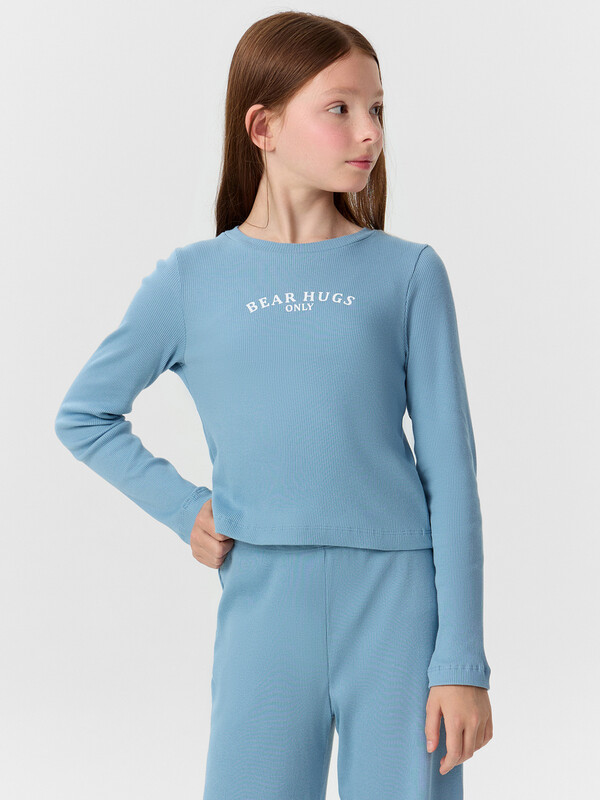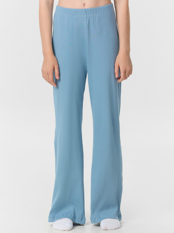 Лонгслив укороченный. Горловина круглой формы с притачной обтачкой из основного полотна. Рукава длинные втачные. Перед и спинка цельнокроеные. Низ лонгслива, рукавов и брюк обработан на 2-х игольной плоскошовной машине швом в подгибку. Брюки длинные, прямые, свободные. Пояс цельнокроенный с эластичной тесьмой внутри (внутренняя резина 35RV) ширина 35мм.