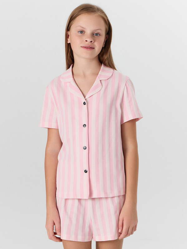 Комплект состоит из рубашки и шорт. Рубашка прямого силуэта, с отложным воротником, спинка цельнокроеная. Плечо слегка спущено. Рукав втачной, одношовный, короткий. Центральная застежка на пуговицы.