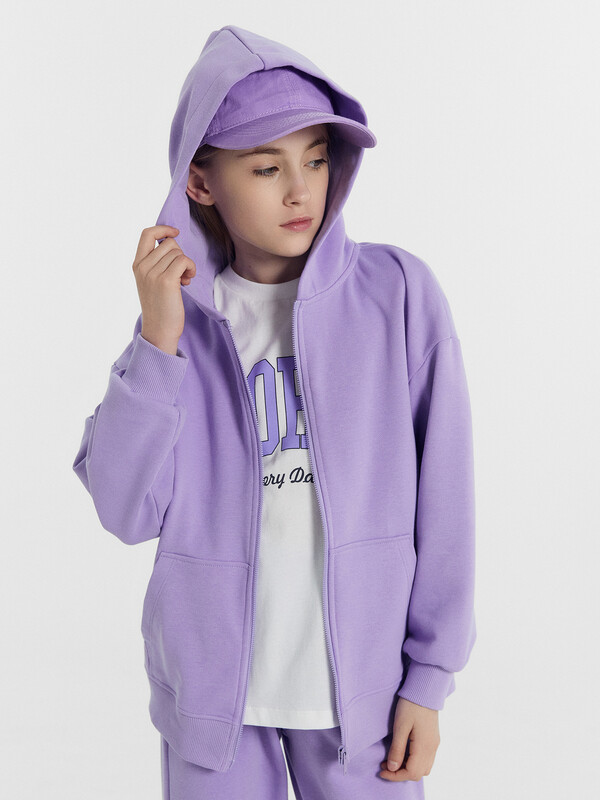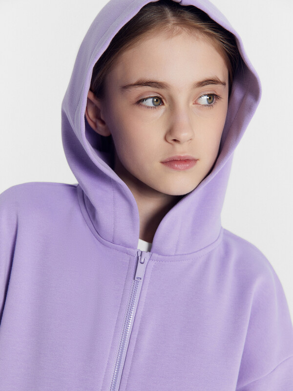Жакет свободного силуэта с капюшоном. Капюшон на подкладке из основного полотна. Шов втачивания капюшона закрыт х/б тесьмой. Рукава втачные, линия плеча спущена. Притачные манжеты по низу рукавов и притачной пояс из рибаны. По переду застежка молния, карман кенгуру.