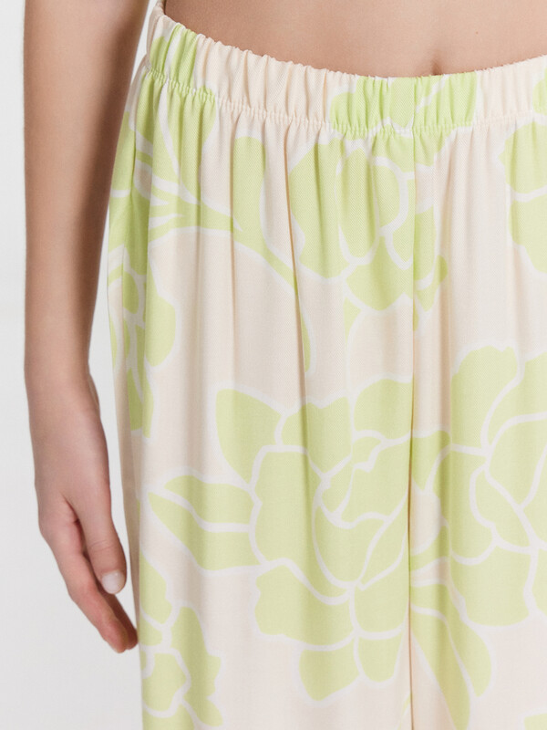 Комплект состоит из топа и брюк. Топ с узкими бретелями и с воланом на сборке по низу. Брюки прямые с цельнокроенным поясом. Внутрь пояса застрочена эластичная тесьма. Низ изделия обработан швом в подгибку с закрытым срезом.