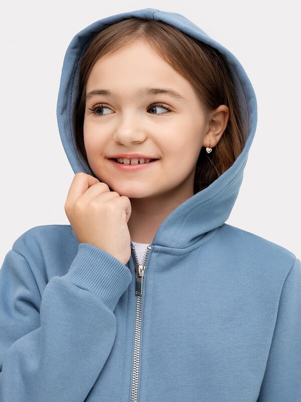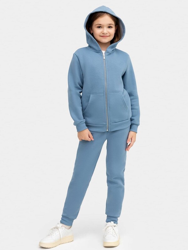 Комплект из трикотажного футера без подчеса. Жакет прямого силуэта с застежкой на молнию, уютным капюшоном, длинными рукавами, немного спущенной линией плеча, манжетами и поясом из рибаны. Брюки прямого силуэта, с резинкой и регулировочным шнурком в поясе. Универсальный комплект для вашей девочки!