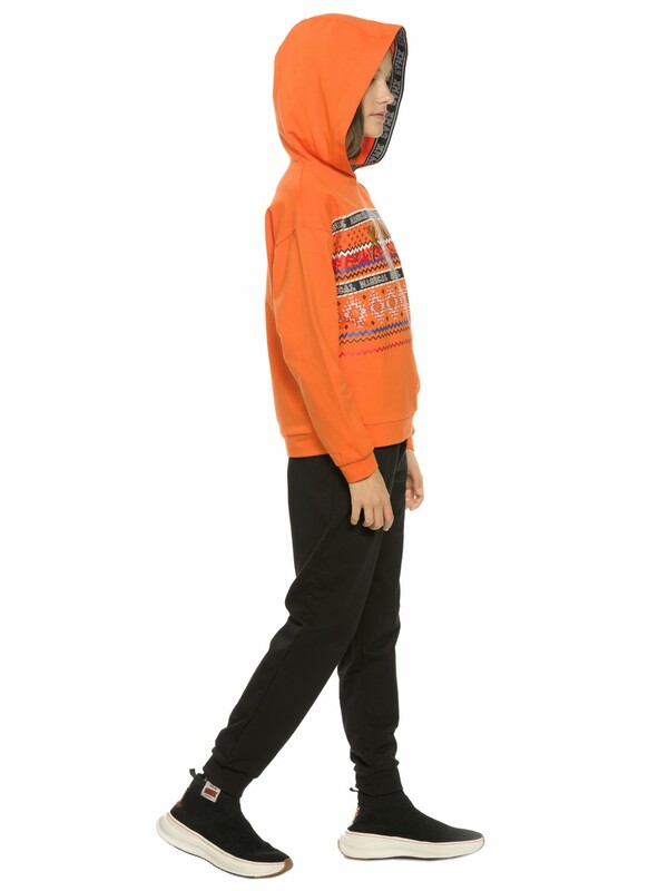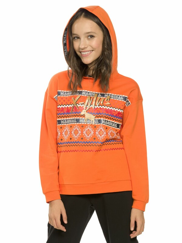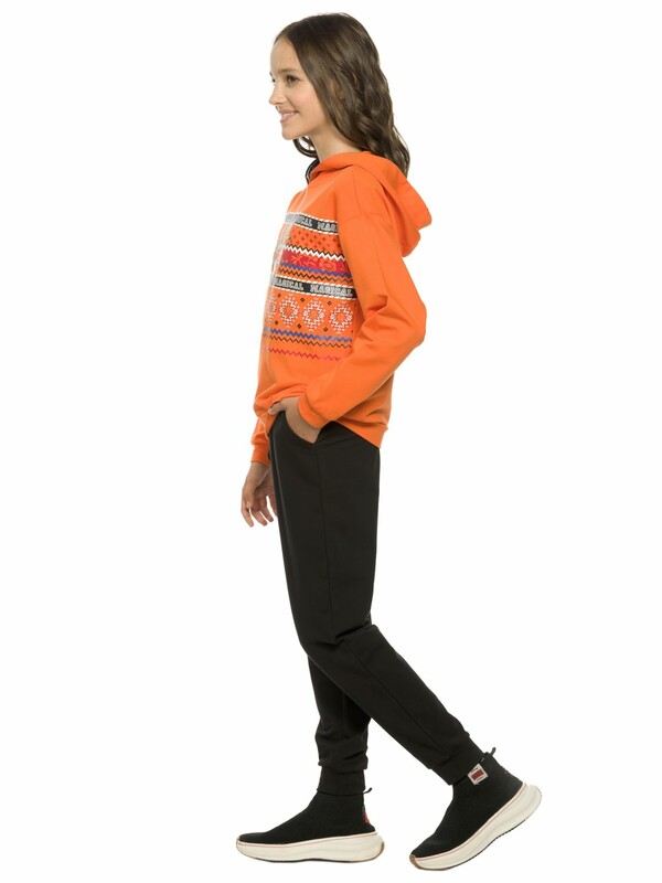 Комплект для девочек. Худи из футера оверсайз силуэта. Капюшон изнутри отделан декоративной тесьмой с вытканным рисунком, перевод Рождество. Линия плеча спущена, манжеты по низу рукавов и изделия из основной ткани. Rubber принт с золотом и глиттером. Перевод Волшебное Рождество. Брюки из футера умеренного объема с манжетами и поясом из основной ткани, карманы в боковых швах.