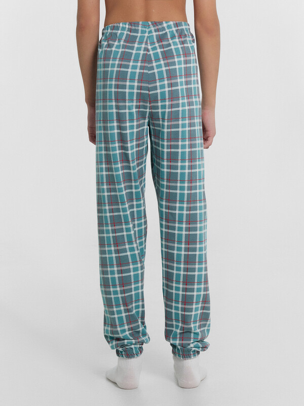 Горловина круглой формы с притачной обтачкой из основного полотна. Рукава длинные втачные. Перед и спинка цельнокроеные. Низ джемпера и рукавов обработан швом в подгибку. Брюки длинные, немного заужены к низу. Пояс цельнокроенный с эластичной тесьмой внутри. Низ брюк застрочен с эластичной тесьмой внутри.