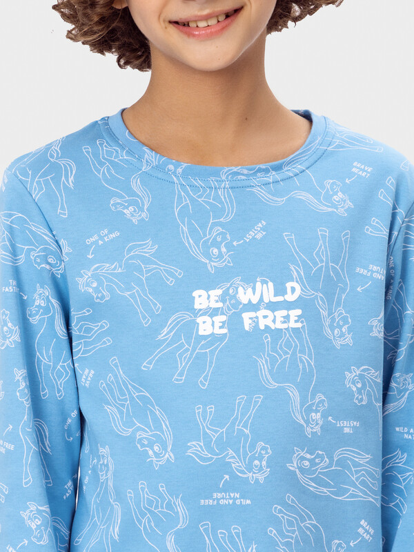 Пижама для мальчиков с надписью "Be wild. Be free" ("Будь диким. Будь свободным") — это комплект для смелых и активных ребят. В набор входит свободный джемпер и прямые брюки, сшитые из мягкой дышащей ткани, которая не раздражает кожу даже во время сна.