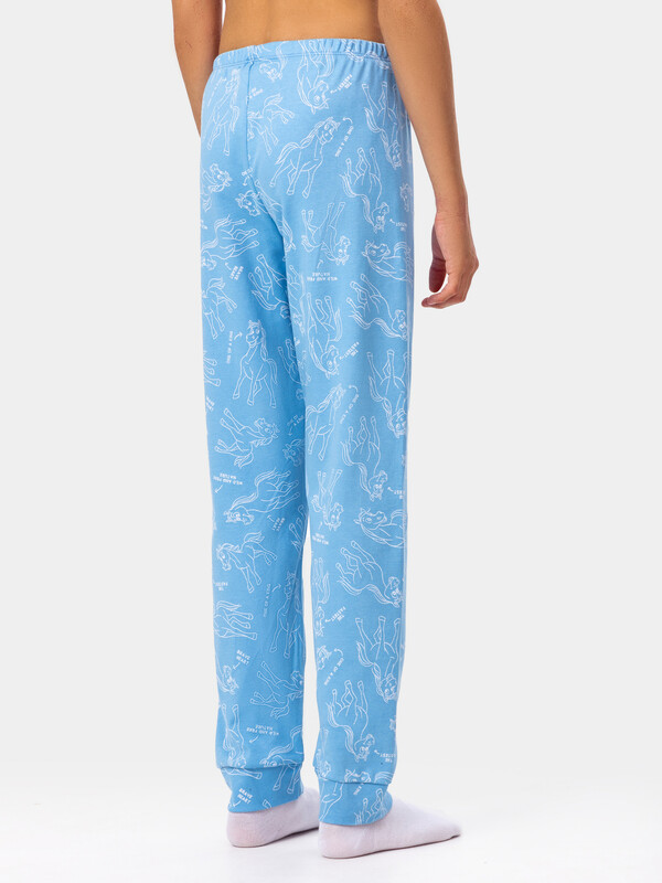 Джемпер с круглой горловиной и удлиненными рукавами на манжетах удобно сидит по фигуре, не сковывая движения. Низ изделия аккуратно подогнут для опрятного вида. Брюки с широким эластичным поясом мягко фиксируются на талии, а манжеты внизу не дают им задираться во время активных игр или отдыха.