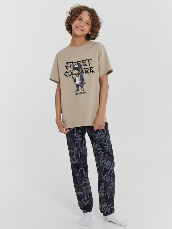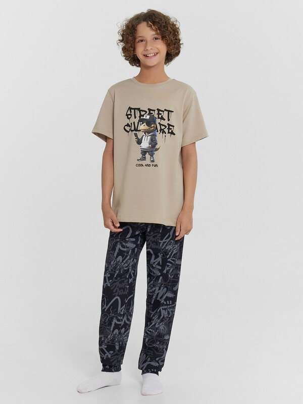 Повседневная пижама для мальчиков из высококачественного хлопка. Состоит из футболки с коротким рукавом и длинных брюк с эластичной резинкой в поясе. Брюки завершаются манжетами. Изготовлена пижама для мальчика из высококачественного натурального материала, что обеспечивает комфорт как в летний, так и в зимний период. Материал отлично тянется, хорошо впитывает влагу и быстро сохнет, не сковывает движений и не создает парникового эффекта. Отличный вариант для каждодневной носки. Пижама детская для подростка мальчика отлично подходит для отдыха в комфортной домашней обстановке и сна. В линейке много интересных расцветок, есть красивые варианты с принтами. Если вы устали от простых и незамысловатых моделей и хотите разнообразить гардероб вашего ребенка, этот вариант порадует. Такая пижама понравится всем мальчикам и подросткам, ведь она выполнена в ярких цветах и украшена рисунками. Купить пижаму детскую недорого можно у нас на сайте и в магазинах Mark Formelle!