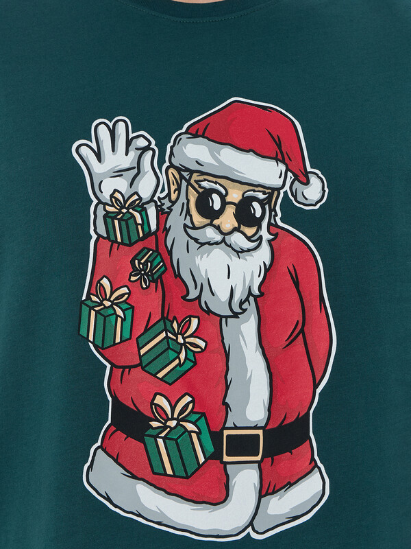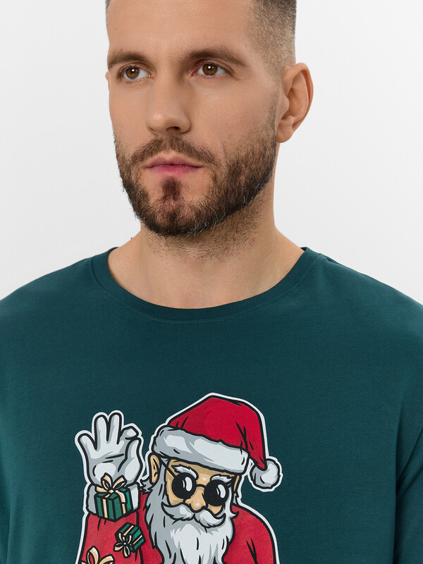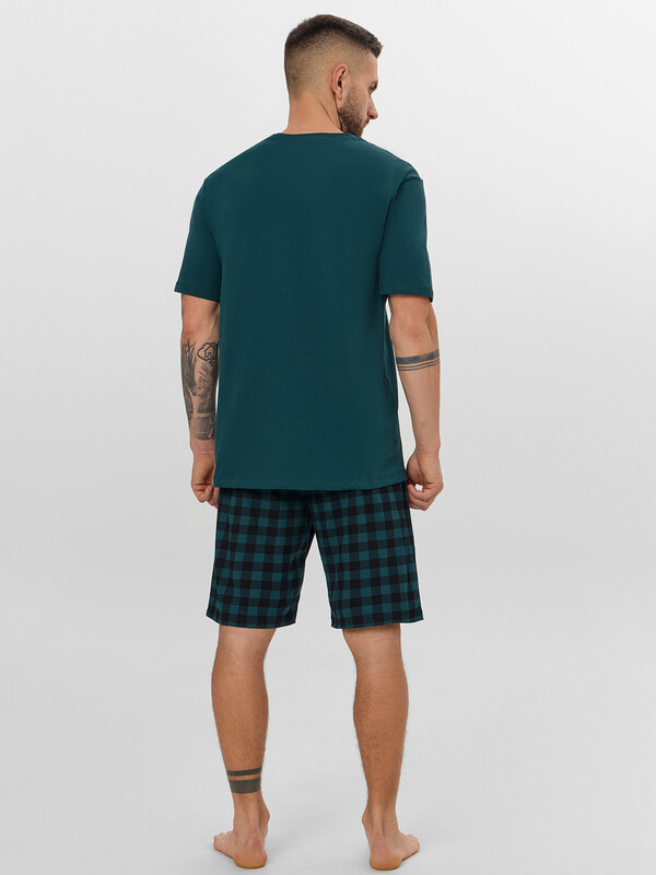 Пижама состоит из футболки и шорт. Футболка прямого силуэта. Горловина округлой формы обработана обтачкой из рибаны. Шов втачивания обтачки по спинке закрыт бейкой из основного полотна. Нижние срезы футболки и рукавов обработаны швом вподгибку.
