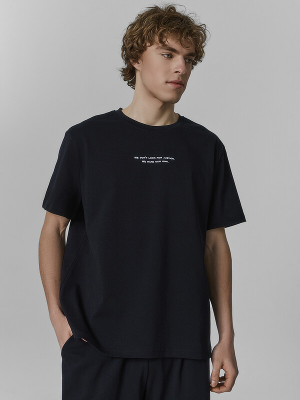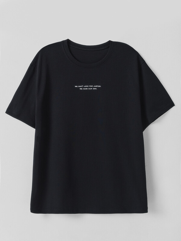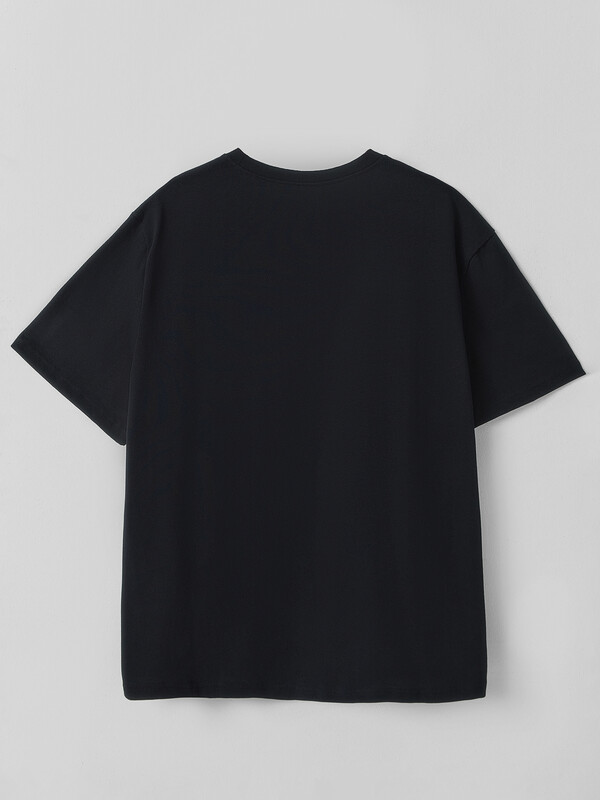 Футболка свободная, oversize. Длина до середины бедер. Горловина округлой формы обработана обтачкой из основного полотна. Шов втачивания обтачки отстрочен декоративной строчкой.Плечо спущено. Рукава втачные короткие. Низ футболки обработан швом вподгибку.