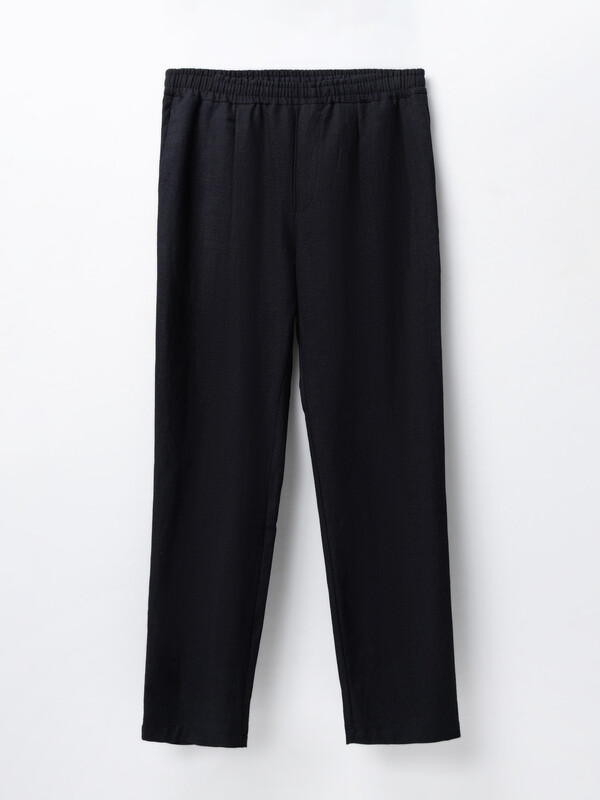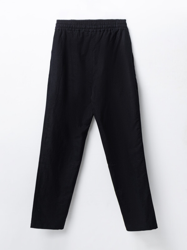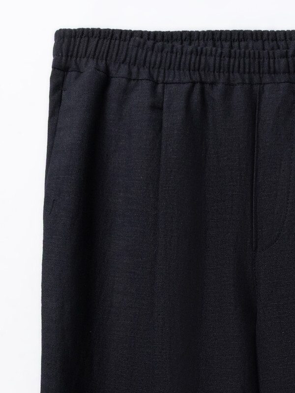 Низ брюк обработан швом в подгибку с открытым срезом.