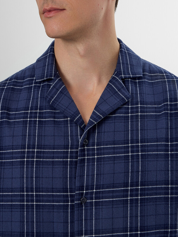 Мужской домашний комплект в классическую клетку станет идеальным спутником для отдыха. Пижама, состоящая из рубашки и брюк, выполнена из хлопка, который дарит коже приятные ощущения и обеспечивает комфорт весь день. Свободная рубашка прямого силуэта с V-образным вырезом и отложным воротником выглядит элегантно и не сковывает движений. Длинные рукава со спущенным плечом и аккуратно обработанными манжетами дополняют образ. Прямые брюки с удобным цельнокроеным поясом на эластичной тесьме мягко сидят по фигуре. Практичные боковые карманы и аккуратная обработка низа подчеркивают качество исполнения.