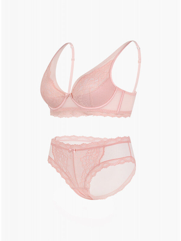 Комплект нижнего белья от торговой марки Индефини. В комплекте бюстгальтер и трусики. Бюстгальтер из полиамида, розового цвета, с кружевными вставками и обрамлением, с формованными чашками, на косточках, без Push-up, с косточками по бокам, на поясе из микросетки, на тонких лямках, на застежках-крючках, лямки регулируются. Трусы-слипы из полиамида, розового цвета, из кружевной ткани, со вставками из микросетки, с обрамлением, на мягкой резинке, средней посадки.